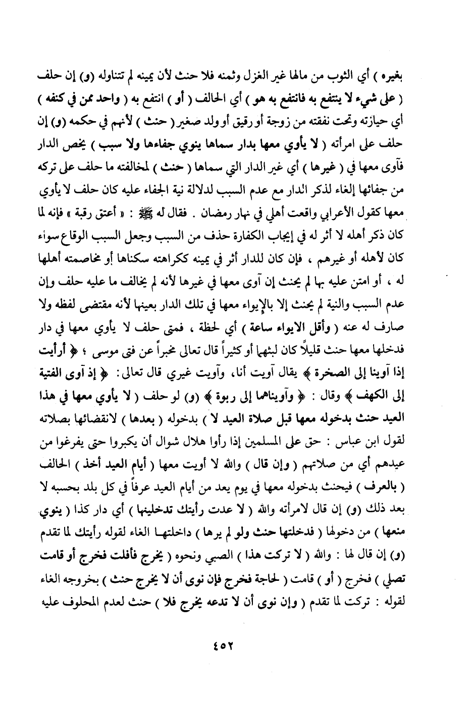(وَ) إنْ حَلَفَ عَلَى امْرَأَتِهِ (لَا يَأْوِي مَعَهَا بِدَارٍ سَمَّاهَا يَنْوِي جَفَاءَهَا وَلَا سَبَبَ) يَخُصُّ الدَّارَ فَآوَى مَعَهَا فِي (غَيْرِهَا) أَيْ: غَيْرِ الدَّارِ الَّتِي سَمَّاهَا (حَنِثَ) لِمُخَالَفَتِهِ مَا حَلَفَ عَلَى تَرْكِهِ مِنْ جَفَائِهَا إلْغَاءً لِذِكْرِ الدَّارِ مَعَ عَدَمِ السَّبَبِ لِدَلَالَةِ نِيَّةِ الْجَفَاءِ عَلَيْهِ كَانَ حَلَفَ لَا يَأْوِي مَعَهَا «كَقَوْلِ الْأَعْرَابِيِّ وَاقَعْتُ أَهْلِي فِي نَهَارِ رَمَضَانَ، فَقَالَ لَهُ صَلَّى اللَّهُ عَلَيْهِ وَسَلَّمَ: أَعْتِقْ رَقَبَةً» فَإِنَّهُ لَمَّا كَانَ ذِكْرُ أَهْلِهِ لَا أَثَرَ لَهُ فِي إيجَابِ الْكَفَّارَةِ حُذِفَ مِنْ السَّبَبِ وَجُعِلَ السَّبَبُ الْوِقَاعَ سَوَاءٌ كَانَ لِأَهْلِهِ أَوْ غَيْرِهِمْ، فَإِنْ كَانَ لِلدَّارِ أَثَرٌ فِي يَمِينِهِ كَكَرَاهَتِهِ سُكْنَاهَا أَوْ مُخَاصَمَتِهِ أَهْلَهَا لَهُ، أَوْ امْتَنَّ عَلَيْهِ بِهَا لَمْ يَحْنَثْ إنْ آوَى مَعَهَا فِي غَيْرِهَا لِأَنَّهُ لَمْ يُخَالِفْ مَا عَلَيْهِ حَلَفَ وَإِنْ عَدِمَ السَّبَبَ وَالنِّيَّةَ لَمْ يَحْنَثْ إلَّا بِالْإِيوَاءِ مَعَهَا فِي تِلْكَ الدَّارِ بِعَيْنِهَا لِأَنَّهُ مُقْتَضَى لَفْظِهِ وَلَا صَارِفَ لَهُ عَنْهُ (وَأَقَلُّ الْإِيوَاءِ سَاعَةٌ) أَيْ: لَحْظَةٌ، فَمَتَى حَلَفَ لَا يَأْوِي مَعَهَا فِي دَارٍ فَدَخَلَهَا مَعَهَا حَنِثَ قَلِيلًا كَانَ لُبْثُهُمَا أَوْ كَثِيرًا قَالَ تَعَالَى مُخْبِرًا عَنْ فَتَى مُوسَى ; {أَرَأَيْتَ إذْ أَوَيْنَا إلَى الصَّخْرَةِ} [الكهف: ٦٣] يُقَالُ آوَيْت أَنَا، وَآوَيْت غَيْرِي قَالَ تَعَالَى: {إذْ أَوَى الْفِتْيَةُ إلَى الْكَهْفِ} [الكهف: ١٠] وَقَالَ: {وَآوَيْنَاهُمَا إلَى رَبْوَةٍ} [المؤمنون: ٥٠] .