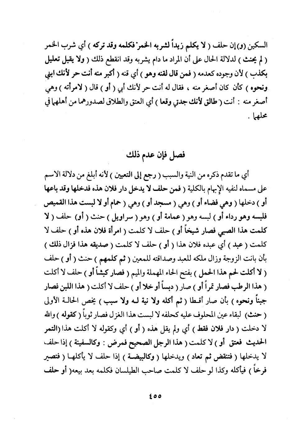 فَصْلٌ فَإِنْ عَدِمَ ذَلِكَ أَيْ: مَا تَقَدَّمَ ذِكْرُهُ مِنْ النِّيَّةِ وَالسَّبَبِ (رَجَعَ إلَى التَّعَيُّنِ) لِأَنَّهُ أَبْلَغُ مِنْ دَلَالَةِ الِاسْمِ عَلَى مُسَمَّاهُ لِنَفْيِهِ الْإِبْهَامَ بِالْكُلِّيَّةِ (فَمَنْ حَلَفَ لَا يَدْخُلُ دَارَ فُلَانٍ هَذِهِ فَدَخَلَهَا وَقَدْ بَاعَهَا أَوْ) دَخَلَهَا (وَهِيَ فَضَاءٌ أَوْ) وَهِيَ (مَسْجِدٌ أَوْ) وَهِيَ (حَمَّامٌ أَوْ لَا لَبِسْت هَذَا الْقَمِيصَ فَلَبِسَهُ وَهُوَ رِدَاءٌ أَوْ) لَبِسَهُ وَهُوَ (عِمَامَةٌ أَوْ) وَهُوَ (سَرَاوِيلُ) حَنِثَ (أَوْ) حَلَفَ (لَا كَلَّمْت هَذَا الصَّبِيَّ فَصَارَ شَيْخًا أَوْ) حَلَفَ لَا كَلَّمْت (امْرَأَةَ فُلَانٍ هَذِهِ أَوْ) حَلَفَ لَا كَلَّمْت (عَبْدَ) أَيْ: عَبْدَهُ فُلَانٌ هَذَا (أَوْ) حَلَفَ لَا كَلَّمْت (صَدِيقَهُ هَذَا فَزَالَ ذَلِكَ) بِأَنْ بَانَتْ الزَّوْجَةُ وَزَالَ مِلْكُهُ لِلْعَبْدِ وَصَدَاقَتُهُ لِلْمُعَيَّنِ (ثُمَّ كَلَّمَهُمْ) حَنِثَ (أَوْ) حَلَفَ (لَا أَكَلْت لَحْمَ هَذَا الْحَمَلِ) بِفَتْحِ الْحَاءِ الْمُهْمَلَةِ وَالْمِيمِ (فَصَارَ كَبْشًا أَوْ) حَلَفَ لَا أَكَلْت (هَذَا الرُّطَبَ فَصَارَ تَمْرًا أَوْ) صَارَ (دِبْسًا أَوْ خَلًّا أَوْ) حَلَفَ لَا أَكَلْت (هَذَا اللَّبَنَ فَصَارَ جُبْنًا وَنَحْوُهُ) بِأَنْ صَارَ أَقِطًا (ثُمَّ أَكَلَهُ وَلَا نِيَّةَ لَهُ وَلَا سَبَبَ) يَخُصُّ الْحَالَةَ الْأُولَى (حَنِثَ) لِبَقَاءِ عَيْنِ الْمَحْلُوفِ عَلَيْهِ كَحَلِفِهِ لَا لَبِسْت هَذَا الْغَزْلَ فَصَارَ ثَوْبًا (كَقَوْلِهِ) وَاَللَّهِ لَا دَخَلْت (دَارَ فُلَانٍ فَقَطْ) أَيْ: وَلَمْ يَقُلْ هَذِهِ (أَوْ) أَيْ: وَكَقَوْلِ لَا أَكَلْت هَذَا (التَّمْرَ الْحَدِيثِ فَعَتُقَ أَوْ) لَا كَلَّمْت (هَذَا الرَّجُلَ الصَّحِيحَ فَمَرِضَ: وَكَالسَّفِينَةِ) إذَا حَلَفَ لَا يَدْخُلُهَا (فَتُنْقَضُ ثُمَّ تُعَادُ) وَيَدْخُلُهَا (وَكَالْبَيْضَةِ) إذَا حَلَفَ لَا يَأْكُلُهَا (فَتَصِيرُ فَرْخًا) فَيَأْكُلُهُ وَكَذَا لَوْ حَلَفَ لَا كَلَّمْت صَاحِبَ الطَّيْلَسَانِ فَكَلَّمَهُ بَعْدَ بَيْعِهِ (أَوْ حَلَفَ