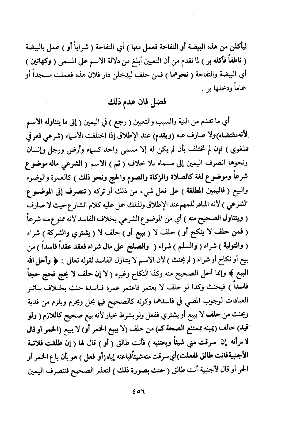 فَصْلٌ فَإِنْ عَدِمَ ذَلِكَ أَيْ مَا تَقَدَّمَ مِنْ النِّيَّةِ وَالسَّبَبِ وَالتَّعْيِينِ (رَجَعَ) فِي الْيَمِينِ (إلَى مَا يَتَنَاوَلُهُ الِاسْمُ لِأَنَّهُ مُقْتَضَاهُ) وَلَا صَارِفَ عَنْهُ (وَيُقَدَّمُ) عِنْدَ الْإِطْلَاقِ إذَا اخْتَلَفَتْ الْأَسْمَاءُ (شَرْعِيٌّ فَعُرْفِيٌّ فَلُغَوِيٌّ) فَإِنْ لَمْ تَخْتَلِفْ بِأَنْ لَمْ يَكُنْ لَهُ إلَّا مُسَمًّى وَاحِدٌ كَسَمَاءٍ وَأَرْضٍ وَرَجُلٍ وَإِنْسَانٍ وَنَحْوِهَا انْصَرَفَ الْيَمِينُ إلَى مُسَمَّاهُ بِلَا خِلَافٍ (ثُمَّ) الِاسْمُ (الشَّرْعِيُّ مَا لَهُ مَوْضُوعٌ شَرْعًا وَمَوْضُوعٌ لُغَةً كَالصَّلَاةِ وَالزَّكَاةِ وَالصَّوْمِ وَالْحَجِّ وَنَحْوِ ذَلِكَ) كَالْعُمْرَةِ وَالْوُضُوءِ وَالْبَيْعِ (فَالْيَمِينُ الْمُطْلَقَةُ) عَلَى فِعْلِ شَيْءٍ مِنْ ذَلِكَ أَوْ تَرْكِهِ (تَنْصَرِفُ إلَى الْمَوْضُوعِ الشَّرْعِيِّ) لِأَنَّهُ الْمُتَبَادِرُ لِلْفَهْمِ عِنْدَ الْإِطْلَاقِ وَلِذَلِكَ حُمِلَ عَلَيْهِ كَلَامُ الشَّارِعِ حَيْثُ لَا صَارِفَ (وَيَتَنَاوَلُ الصَّحِيحَ مِنْهُ) أَيْ: مِنْ الْمَوْضُوعِ الشَّرْعِيِّ بِخِلَافِ الْفَاسِدِ لِأَنَّهُ مَمْنُوعٌ مِنْهُ شَرْعًا (فَمَنْ حَلَفَ لَا يَنْكِحُ أَوْ) حَلَفَ لَا (يَبِيعُ أَوْ) حَلَفَ لَا (يَشْتَرِي وَالشَّرِكَةُ) شِرَاءٌ (وَالتَّوْلِيَةُ) شِرَاءٌ (وَالسَّلَمُ) شِرَاءٌ (وَالصُّلْحُ عَلَى مَالِ شِرَاءٍ فَعَقَدَ عَقْدًا فَاسِدًا) مِنْ بَيْعٍ أَوْ نِكَاحٍ أَوْ شِرَاءٍ (لَمْ يَحْنَثْ) لِأَنَّ الِاسْمَ لَا يَتَنَاوَلُ الْفَاسِدَ لِقَوْلِهِ تَعَالَى: {وَأَحَلَّ اللَّهُ الْبَيْعَ} [البقرة: ٢٧٥] وَإِنَّمَا أَحَلَّ الصَّحِيحَ مِنْهُ.