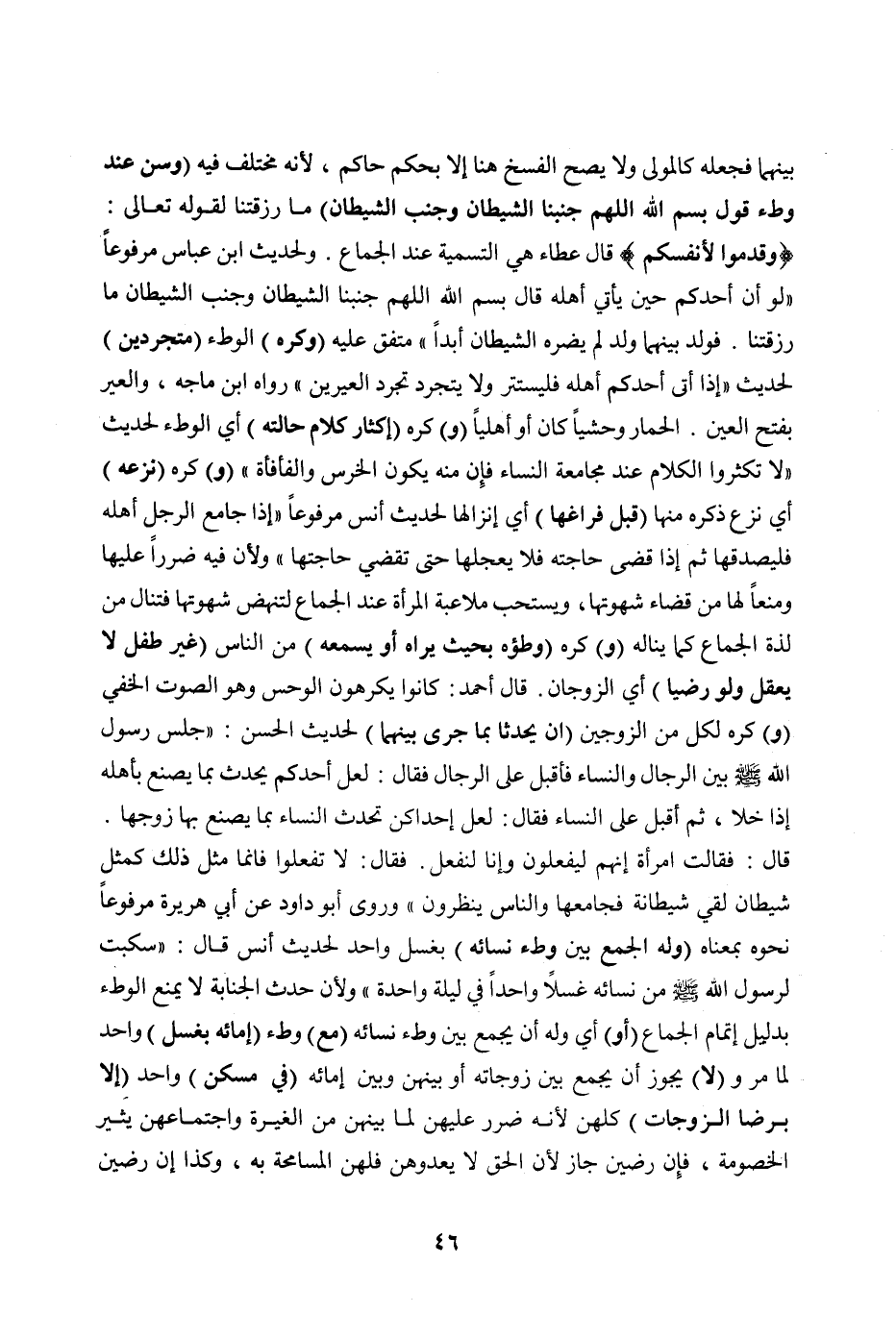 (، وَسُنَّ عِنْدَ وَطْءٍ قَوْلُ بِسْمِ اللَّهِ اللَّهُمَّ جَنِّبْنَا الشَّيْطَانَ، وَجَنِّبْ الشَّيْطَانَ) مَا رَزَقْتَنَا لِقَوْلِهِ تَعَالَى: {وَقَدِّمُوا لِأَنْفُسِكُمْ} [البقرة: ٢٢٣] قَالَ عَطَاءٌ هِيَ التَّسْمِيَةُ عِنْدَ الْجِمَاعِ. وَلِحَدِيثِ ابْنِ عَبَّاسٍ مَرْفُوعًا " «لَوْ أَنَّ أَحَدَكُمْ حِينَ يَأْتِي أَهْلَهُ قَالَ: بِسْمِ اللَّهِ اللَّهُمَّ جَنِّبْنَا الشَّيْطَانَ، وَجَنِّبْ الشَّيْطَانَ مَا رَزَقْتنَا فَوُلِدَ بَيْنَهُمَا وَلَدٌ لَمْ يَضُرَّهُ الشَّيْطَانُ أَبَدًا» " مُتَّفَقٌ عَلَيْهِ.