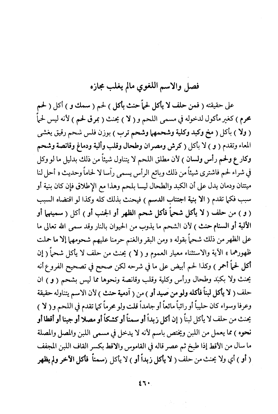 فَصْلٌ وَالِاسْمُ اللُّغَوِيُّ مَا لَمْ يَغْلِبْ مَجَازُهُ عَلَى حَقِيقَتِهِ (فَمَنْ حَلَفَ لَا يَأْكُلُ لَحْمًا حَنِثَ بِأَكْلِ) لَحْمِ (سَمَكٍ وَ) أَكْلِ (لَحْمِ مُحَرَّمٍ) كَغَيْرِ مَأْكُولٍ لِدُخُولِهِ فِي مُسَمَّى اللَّحْمِ وَ (لَا) يَحْنَثُ (بِمَرَقِ لَحْمٍ) لِأَنَّهُ لَيْسَ لَحْمًا (وَلَا) بِأَكْلِ (مُخٍّ وَكَبِدٍ وَكُلْيَةٍ وَشَحْمِهِمَا وَشَحْمِ تَرْبٍ) بِوَزْنِ فَلْسٍ شَحْمٌ رَقِيقٌ يَغْشَى الْمِعَاءَ وَتَقَدَّمَ (وَ) لَا بِأَكْلِ (كَرِشٍ وَمُصْرَانٍ وَطِحَالٍ وَقَلْبٍ وَأَلْيَةٍ وَدِمَاغٍ وَقَانِصَةٍ وَشَحْمٍ وَكَارِعٍ وَلَحْمِ رَأْسٍ وَلِسَانٍ) لِأَنَّ مُطْلَقَ اللَّحْمِ لَا يَتَنَاوَلُ شَيْئًا مِنْ ذَلِكَ بِدَلِيلِ مَا لَوْ وُكِّلَ فِي شِرَاءِ لَحْمٍ فَاشْتَرَى كَبْشًا مِنْ ذَلِكَ وَبَائِعُ الرَّأْسِ يُسَمَّى رَأْسًا لَا لَحَّامًا وَحَدِيثِ «أُحِلَّ لَنَا مَيْتَتَانِ وَدَمَانِ» يَدُلُّ عَلَى أَنَّ الْكَبِدَ وَالطِّحَالَ لَيْسَا بِلَحْمٍ وَهَذَا مَعَ الْإِطْلَاقِ فَإِنْ كَانَ بِنِيَّةٍ أَوْ سَبَبٍ فَكَمَا تَقَدَّمَ (إلَّا بِنِيَّةِ اجْتِنَابِ الدَّسَمِ) فَيَحْنَثُ بِذَلِكَ كُلِّهِ وَكَذَا لَوْ اقْتَضَاهُ السَّبَبُ (وَ)