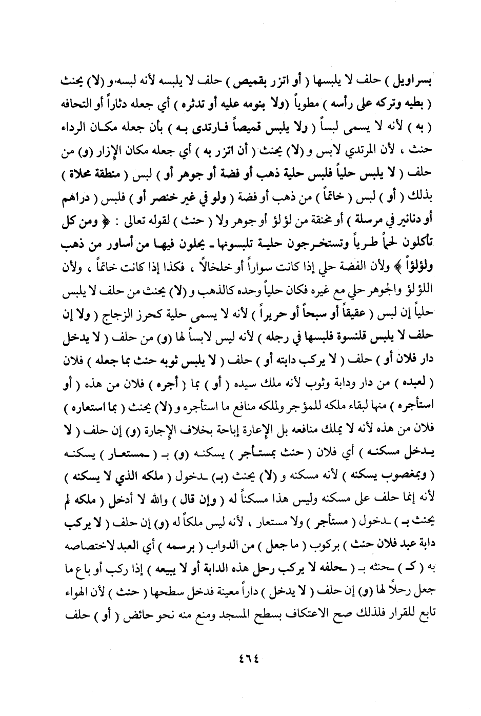 (وَ) مَنْ حَلَفَ (لَا يَلْبَسُ حُلِيًّا فَلَبِسَ حِلْيَةَ ذَهَبٍ أَوْ فِضَّةٍ أَوْ جَوْهَرٍ أَوْ) لَبِسَ (مِنْطَقَةً مُحَلَّاةً) بِذَلِكَ (أَوْ) لَبِسَ (خَاتَمًا) مِنْ ذَهَبٍ أَوْ فِضَّةٍ (وَلَوْ فِي غَيْرِ خِنْصَرٍ أَوْ) فَلَبِسَ (دَرَاهِمَ أَوْ دَنَانِيرَ فِي مُرْسَلَةٍ) أَوْ مِخْنَقَةٍ مِنْ لُؤْلُؤٍ أَوْ جَوْهَرٍ وَ (حِنْثَ) لِقَوْلِهِ تَعَالَى: {وَمِنْ كُلٍّ تَأْكُلُونَ لَحْمًا طَرِيًّا وَتَسْتَخْرِجُونَ حِلْيَةً تَلْبَسُونَهَا} [فاطر: ١٢]- {يُحَلُّونَ فِيهَا مِنْ أَسَاوِرَ مِنْ ذَهَبٍ وَلُؤْلُؤًا} [الحج: ٢٣] وَلِأَنَّ الْفِضَّةَ حُلِيٌّ إذَا كَانَتْ سِوَارًا أَوْ خَلْخَالًا، فَكَذَا إذَا كَانَتْ خَاتَمًا، وَلِأَنَّ اللُّؤْلُؤَ وَالْجَوْهَرَ حُلِيٌّ مَعَ غَيْرِهِ فَكَانَ حُلِيًّا وَحْدَهُ كَالذَّهَبِ وَ (لَا) يَحْنَثُ مَنْ حَلَفَ لَا يَلْبَسُ حُلِيًّا إنْ لَبِسَ (عَقِيقًا أَوْ سَبْحًا أَوْ حَرِيرًا) لِأَنَّهُ لَا يُسَمَّى حِلْيَةً كَحِرْزِ الزُّجَاجِ (وَلَا إنْ حَلَفَ لَا يَلْبَسُ قَلَنْسُوَةً فَلَبِسَهَا فِي رِجْلِهِ) لِأَنَّهُ لَيْسَ لَابِسًا لَهَا