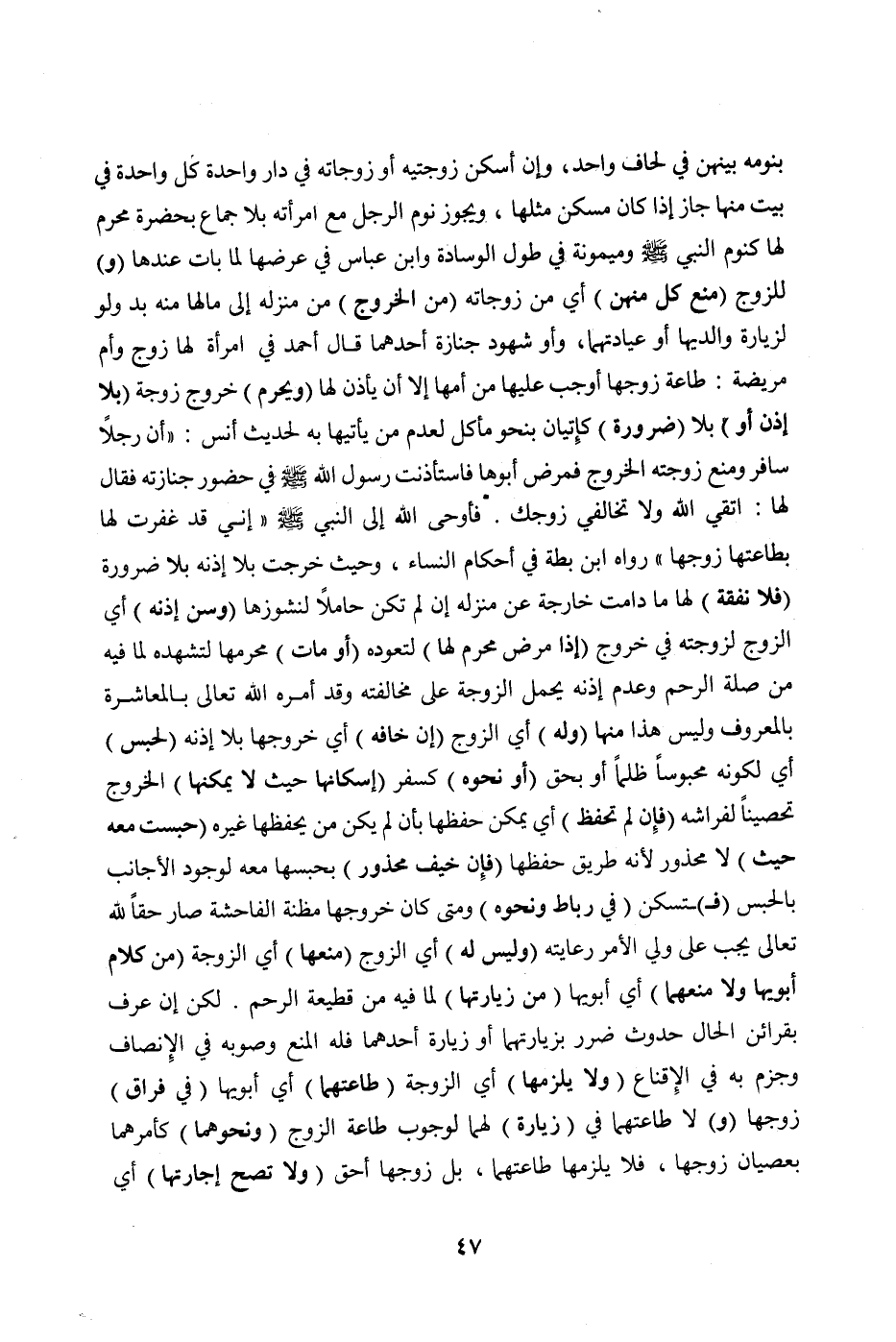 (وَ) لِلزَّوْجِ (مَنْعُ كُلٍّ مِنْهُنَّ) أَيْ: مِنْ زَوْجَاتِهِ (مِنْ الْخُرُوجِ) مِنْ مَنْزِلِهِ إلَى مَا لَهَا مِنْهُ بُدٌّ وَلَوْ لِزِيَارَةِ وَالِدَيْهَا أَوْ عِيَادَتِهِمَا، أَوْ شُهُودِ جِنَازَةِ أَحَدِهِمَا قَالَ أَحْمَدُ فِي امْرَأَةٍ لَهَا زَوْجٌ وَأُمٌّ مَرِيضَةٌ: طَاعَةُ زَوْجِهَا أَوْجَبُ عَلَيْهَا مِنْ أُمِّهَا إلَّا أَنْ يَأْذَنَ لَهَا (وَيَحْرُمُ) خُرُوجُ زَوْجَةٍ (بِلَا إذْنٍ أَوْ) بِلَا (ضَرُورَةٍ) كَإِتْيَانٍ بِنَحْوِ مَأْكَلٍ لِعَدَمِ مَنْ يَأْتِيهَا بِهِ لِحَدِيثِ أَنَسٍ: " «أَنَّ رَجُلًا سَافَرَ، وَمَنَعَ زَوْجَتَهُ الْخُرُوجَ فَمَرِضَ أَبُوهَا فَاسْتَأْذَنَتْ رَسُولَ اللَّهِ صَلَّى اللَّهُ عَلَيْهِ وَسَلَّمَ فِي حُضُورِ جِنَازَتِهِ فَقَالَ لَهَا: اتَّقِي اللَّهَ وَلَا تُخَالِفِي زَوْجَكِ. فَأَوْحَى اللَّهُ إلَى النَّبِيِّ صَلَّى اللَّهُ عَلَيْهِ وَسَلَّمَ إنِّي قَدْ غَفَرْت لَهُ بِطَاعَتِهَا زَوْجَهَا» " رَوَاهُ ابْنُ بَطَّةَ فِي أَحْكَامِ النِّسَاءِ، وَحَيْثُ خَرَجَتْ بِلَا إذْنِهِ بِلَا ضَرُورَةٍ (فَلَا نَفَقَةَ) لَهَا مَا دَامَتْ خَارِجَةً عَنْ مَنْزِلِهِ إنْ لَمْ تَكُنْ حَامِلًا لِنُشُوزِهَا (، وَسُنَّ إذْنُهُ) أَيْ: الزَّوْجِ لِزَوْجَتِهِ فِي خُرُوجٍ (إذَا مَرِضَ مَحْرَمٌ لَهَا) لِتَعُودَهُ (أَوْ مَاتَ) مَحْرَمُهَا لِتَشْهَدَهُ لِمَا فِيهِ مِنْ صِلَةِ الرَّحِمِ وَعَدَمِ إذْنِهِ يَحْمِلُ الزَّوْجَةَ عَلَى مُخَالَفَتِهِ وَقَدْ أَمَرَهُ اللَّهُ تَعَالَى بِالْمُعَاشَرَةِ بِالْمَعْرُوفِ وَلَيْسَ هَذَا مِنْهَا (وَلَهُ) أَيْ: الزَّوْجِ (إنْ خَافَهُ) أَيْ: خُرُوجَهَا بِلَا إذْنِهِ (لِحَبْسٍ) أَيْ: لِكَوْنِهِ مَحْبُوسًا ظُلْمًا أَوْ بِحَقٍّ (أَوْ نَحْوِهِ) كَسَفَرٍ (إسْكَانُهَا حَيْثُ لَا يُمْكِنُهَا) الْخُرُوجُ تَحْصِينًا لِفِرَاشِهِ (فَإِنْ لَمْ تُحْفَظْ) أَيْ: يُمْكِنُ حِفْظُهَا بِأَنْ لَمْ يَكُنْ مَنْ يَحْفَظُهَا غَيْرَهُ (حُبِسَتْ مَعَهُ حَيْثُ) لَا مَحْذُورَ ; لِأَنَّهُ طَرِيقُ حِفْظِهَا (فَإِنْ خِيفَ مَحْذُورٌ) بِحَبْسِهَا مَعَهُ لِوُجُودِ الْأَجَانِبِ بِالْحَبْسِ (فَ) تَسْكُنُ (فِي رِبَاطٍ وَنَحْوِهِ) وَمَتَى كَانَ خُرُوجُهَا مَظِنَّةَ الْفَاحِشَةِ صَارَ حَقًّا لِلَّهِ تَعَالَى يَجِبُ عَلَى وَلِيِّ الْأَمْرِ رِعَايَتُهُ.