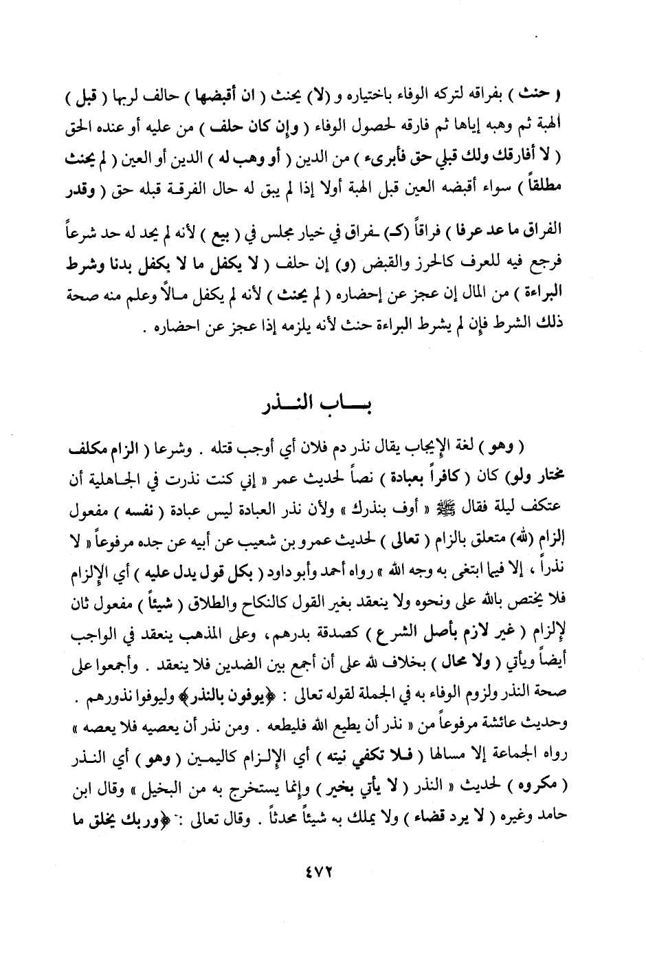 (وَهُوَ) لُغَةً الْإِيجَابُ يُقَالُ نَذَرَ دَمَ فُلَانٍ أَيْ: أَوْجَبَ قَتْلَهُ. وَشَرْعًا (إلْزَامُ مُكَلَّفٍ مُخْتَارٍ وَلَوْ) كَانَ (كَافِرًا بِعِبَادَةٍ) نَصًّا لِحَدِيثِ عُمَرَ «: إنِّي كُنْتُ نَذَرْتُ فِي الْجَاهِلِيَّةِ أَنْ أَعْتَكِفَ لَيْلَةً فَقَالَ صَلَّى اللَّهُ عَلَيْهِ وَسَلَّمَ أَوْفِ بِنَذْرِكَ» وَلِأَنَّ نَذْرَ الْعِبَادَةِ لَيْسَ عِبَادَةً (نَفْسَهُ) مَفْعُولُ إلْزَامٍ (لِلَّهِ) مُتَعَلِّقٌ بِإِلْزَامُ (تَعَالَى) لِحَدِيثِ عَمْرِو بْنِ شُعَيْبٍ عَنْ أَبِيهِ عَنْ جَدِّهِ مَرْفُوعًا «لَا نَذْرَ إلَّا فِيمَا اُبْتُغِيَ بِهِ وَجْهُ اللَّهِ» رَوَاهُ أَحْمَدُ وَأَبُو دَاوُد (بِكُلِّ قَوْلٍ يَدُلُّ عَلَيْهِ) أَيْ: الْإِلْزَامِ فَلَا يَخْتَصُّ بِاَللَّهِ عَلَيَّ وَنَحْوِهِ وَلَا يَنْعَقِدُ بِغَيْرِ الْقَوْلِ كَالنِّكَاحِ وَالطَّلَاقِ (شَيْئًا) مَفْعُولٌ ثَانٍ لِإِلْزَامٍ (غَيْرَ لَازِمٍ بِأَصْلِ الشَّرْعِ) كَصَدَقَةٍ بِدِرْهَمٍ، وَعَلَى الْمَذْهَبِ يَنْعَقِدُ فِي الْوَاجِبِ أَيْضًا وَيَأْتِي (وَلَا مُحَالَ) بِخِلَافِ لِلَّهِ عَلَيَّ أَنْ أَجْمَعَ بَيْنَ الضِّدَّيْنِ فَلَا يَنْعَقِدُ. وَأَجْمَعُوا عَلَى صِحَّةِ النَّذْرِ وَلُزُومِ الْوَفَاءِ بِهِ فِي الْجُمْلَةِ لِقَوْلِهِ تَعَالَى: {يُوفُونَ بِالنَّذْرِ} [الإنسان: ٧] {وَلْيُوفُوا نُذُورَهُمْ} [الحج: ٢٩] . وَحَدِيثِ عَائِشَةَ مَرْفُوعًا " مَنْ «نَذَرَ أَنْ يُطِيعَ اللَّهَ فَلْيُطِعْهُ، وَمَنْ نَذَرَ أَنْ يَعْصِيَهُ فَلَا يَعْصِهِ» رَوَاهُ الْجَمَاعَةُ إلَّا مُسْلِمًا (فَلَا تَكْفِي نِيَّتُهُ) أَيْ: الْإِلْزَامِ كَالْيَمِينِ (وَهُوَ) أَيْ: النَّذْرُ (مَكْرُوهٌ) لِحَدِيثِ «النَّذْرُ لَا يَأْتِي بِخَيْرٍ وَإِنَّمَا يُسْتَخْرَجُ بِهِ مِنْ الْبَخِيلِ» وَقَالَ ابْنُ حَامِدٍ وَغَيْرُهُ (لَا يَرُدُّ قَضَاءً) وَلَا يَمْلِكُ بِهِ شَيْئًا مُحْدَثًا. وَقَالَ تَعَالَى: