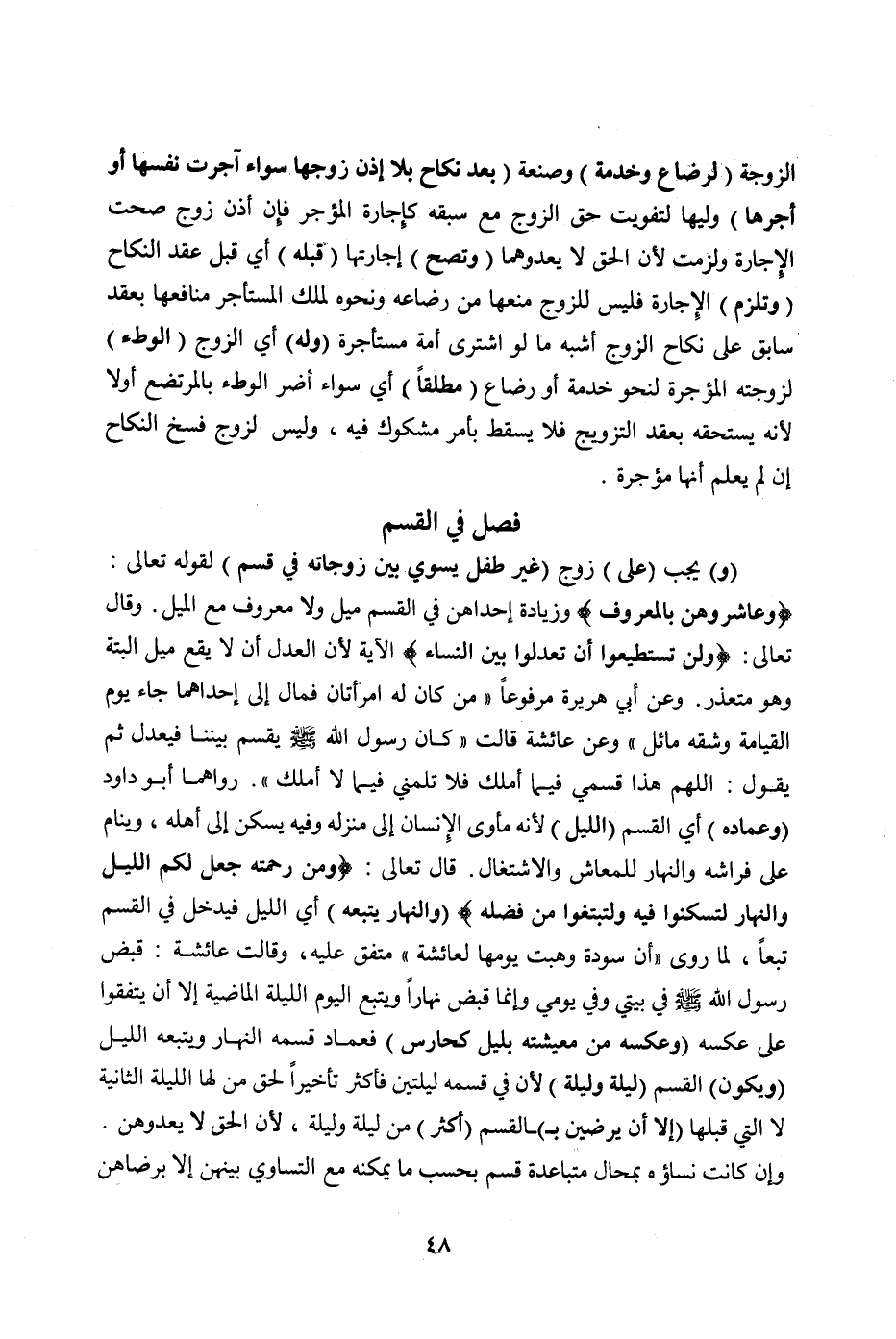(، وَ) يَجِبُ (عَلَى) زَوْجٍ (غَيْرِ طِفْلٍ أَنْ يُسَوِّيَ بَيْنَ زَوْجَاتِهِ فِي قَسْمٍ) لِقَوْلِهِ تَعَالَى: {وَعَاشِرُوهُنَّ بِالْمَعْرُوفِ} [النساء: ١٩] وَزِيَادَةُ إحْدَاهُنَّ فِي الْقَسْمِ مَيْلٌ، وَقَالَ تَعَالَى: {وَلَنْ تَسْتَطِيعُوا أَنْ تَعْدِلُوا بَيْنَ النِّسَاءِ} [النساء: ١٢٩] الْآيَة ; لِأَنَّ الْعَدْلَ أَنْ لَا يَقَعَ مَيْلٌ أَلْبَتَّةَ وَهُوَ مُتَعَذِّرٌ.، وَعَنْ أَبِي هُرَيْرَةَ مَرْفُوعًا " «مَنْ كَانَ لَهُ امْرَأَتَانِ فَمَالَ إلَى إحْدَاهُمَا جَاءَ يَوْمَ الْقِيَامَةِ، وَشِقُّهُ مَائِلٌ» "، وَعَنْ عَائِشَةَ قَالَتْ " «كَانَ رَسُولُ اللَّهِ صَلَّى اللَّهُ عَلَيْهِ وَسَلَّمَ يَقْسِمُ بَيْنَنَا فَيَعْدِلُ ثُمَّ يَقُولُ: اللَّهُمَّ هَذَا قَسْمِي فِيمَا أَمْلِكُ فَلَا تَلُمْنِي فِيمَا لَا أَمْلِكُ» ". رَوَاهُمَا أَبُو دَاوُد (وَعِمَادُهُ) أَيْ: الْقَسْمِ (اللَّيْلُ) ; لِأَنَّهُ مَأْوَى الْإِنْسَانِ إلَى مَنْزِلِهِ، وَفِيهِ يَسْكُنُ إلَى أَهْلِهِ، وَيَنَامُ عَلَى فِرَاشِهِ، وَالنَّهَارُ لِلْمَعَاشِ وَالِاشْتِغَالِ. قَالَ تَعَالَى: {وَمِنْ رَحْمَتِهِ جَعَلَ لَكُمْ اللَّيْلَ، وَالنَّهَارَ لِتَسْكُنُوا فِيهِ وَلِتَبْتَغُوا مِنْ فَضْلِهِ} [القصص: ٧٣] (وَالنَّهَارُ يَتْبَعُهُ) أَيْ: اللَّيْلَ فَيَدْخُلُ فِي الْقَسْمِ تَبَعًا، لِمَا رُوِيَ " أَنَّ «سَوْدَةَ وَهَبَتْ يَوْمَهَا لِعَائِشَةَ» مُتَّفَقٌ عَلَيْهِ، وَقَالَتْ عَائِشَةُ: قُبِضَ رَسُولُ اللَّهِ صَلَّى اللَّهُ عَلَيْهِ وَسَلَّمَ فِي بَيْتِي، وَفِي يَوْمِي وَإِنَّمَا قُبِضَ نَهَارًا، وَيَتْبَعُ الْيَوْمُ اللَّيْلَةَ الْمَاضِيَةَ إلَّا أَنْ يَتَّفِقُوا عَلَى عَكْسِهِ (وَعَكْسُهُ مِنْ مَعِيشَتِهِ بِلَيْلٍ كَحَارِسٍ) فَعِمَادُ قَسْمِهِ النَّهَارُ، وَيَتْبَعُهُ اللَّيْلُ (وَيَكُونُ) الْقَسْمُ (لَيْلَةً وَلَيْلَةً) ; لِأَنَّ فِي قَسْمِهِ لَيْلَتَيْنِ فَأَكْثَرَ تَأْخِيرًا لِحَقِّ مَنْ لَهَا اللَّيْلَةُ الثَّانِيَةِ لَا الَّتِي قَبْلَهَا (إلَّا أَنْ يَرْضَيْنَ بِ) الْقَسْمِ (أَكْثَرَ) مِنْ لَيْلَةٍ وَلَيْلَةٍ ; لِأَنَّ الْحَقَّ لَا يَعْدُوهُنَّ. وَإِنْ كَانَتْ نِسَاؤُهُ بِمَحَالٍّ مُتَبَاعِدَةٍ قَسَمَ بِحَسَبِ مَا يُمْكِنُهُ مَعَ التَّسَاوِي بَيْنَهُنَّ إلَّا بِرِضَاهُنَّ.