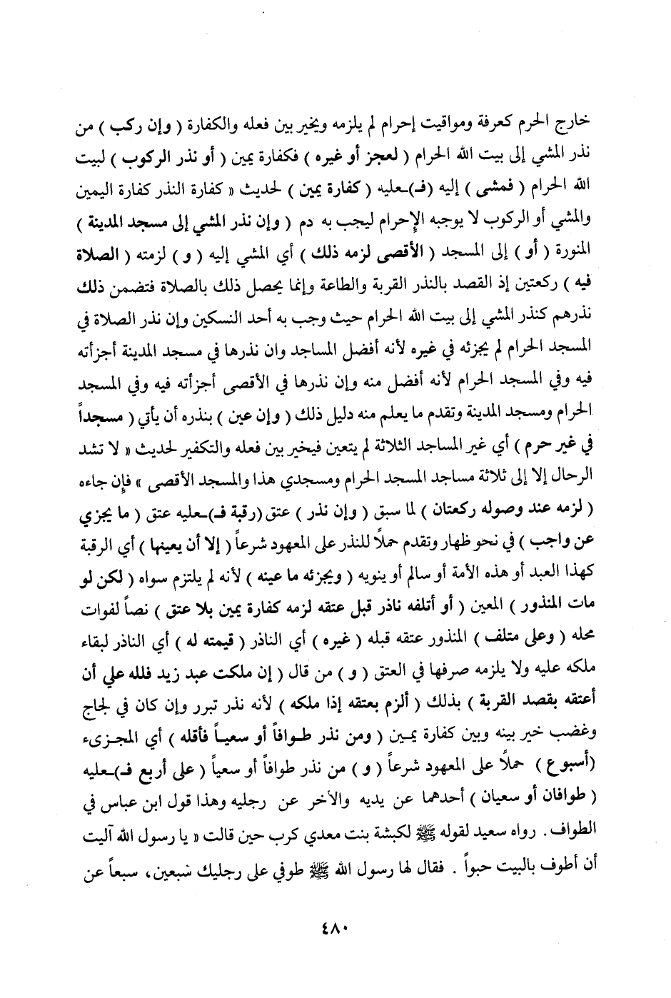 (فَ) عَلَيْهِ (كَفَّارَةُ يَمِينٍ) لِحَدِيثِ «كَفَّارَةُ النَّذْرِ كَفَّارَةُ الْيَمِينِ» وَالْمَشْيُ أَوْ الرُّكُوبُ لَا يُوجِبُهُ الْإِحْرَامُ لِيَجِبَ بِهِ دَمٌ (وَإِنْ نَذَرَ الْمَشْيَ إلَى مَسْجِدِ الْمَدِينَةِ) الْمُنَوَّرَةِ (أَوْ) إلَى الْمَسْجِدِ (الْأَقْصَى لَزِمَهُ ذَلِكَ) أَيْ: الْمَشْيُ إلَيْهِ.