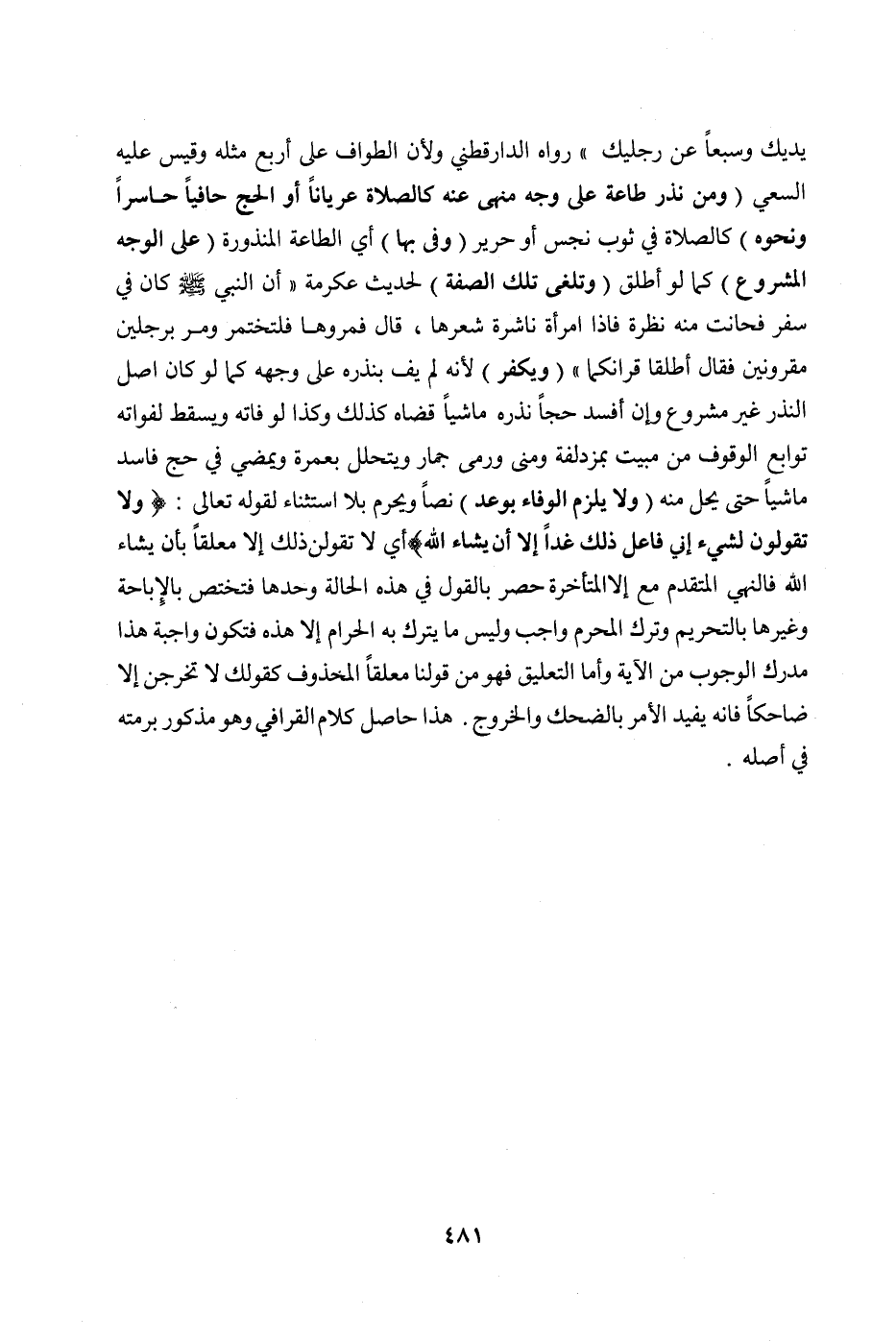 (وَمَنْ نَذَرَ طَاعَةً عَلَى وَجْهٍ مَنْهِيٍّ عَنْهُ كَالصَّلَاةِ عُرْيَانًا أَوْ الْحَجِّ حَافِيًا حَاسِرًا وَنَحْوَهُ) كَالصَّلَاةِ فِي ثَوْبٍ نَجِسٍ أَوْ حَرِيرٍ (وَفَّى بِهَا) أَيْ: الطَّاعَةِ الْمَنْذُورَةِ (عَلَى الْوَجْهِ الْمَشْرُوعِ) كَمَا لَوْ أَطْلَقَ (وَتُلْغَى تِلْكَ الصِّفَةُ) لِحَدِيثِ عِكْرِمَةَ «أَنَّ النَّبِيَّ صَلَّى اللَّهُ عَلَيْهِ وَسَلَّمَ كَانَ فِي سَفَرٍ فَحَانَتْ مِنْهُ نَظْرَةٌ فَإِذَا امْرَأَةٌ نَاشِرَةٌ شَعْرَهَا، قَالَ: فَمُرُوهَا فَلْتَخْتَمِرْ. وَمَرَّ بِرَجُلَيْنِ مَقْرُونَيْنِ فَقَالَ: أَطْلِقَا قِرَانَكُمَا» (وَيُكَفِّرُ) لِأَنَّهُ لَمْ يَفِ بِنَذْرِهِ عَلَى وَجْهِهِ كَمَا لَوْ كَانَ أَصْلُ النَّذْرِ غَيْرَ مَشْرُوعٍ وَإِنْ أَفْسَدَ حَجًّا نَذَرَهُ مَاشِيًا قَضَاهُ كَذَلِكَ وَكَذَا لَوْ فَاتَهُ وَيَسْقُطُ لِفَوَاتِهِ تَوَابِعَ الْوُقُوفِ مِنْ مَبِيتٍ بِمُزْدَلِفَةَ وَمِنًى وَرَمْيِ جِمَارٍ وَيَتَحَلَّلُ بِعُمْرَةٍ وَيَمْضِي فِي حَجٍّ فَاسِدٍ مَاشِيًا حَتَّى يَحِلَّ مِنْهُ (وَلَا يَلْزَمُ الْوَفَاءُ بِوَعْدٍ) نَصًّا وَيَحْرُمُ بِلَا اسْتِثْنَاءٍ لِقَوْلِهِ تَعَالَى: {وَلَا تَقُولَنَّ لِشَيْءٍ إنِّي فَاعِلٌ ذَلِكَ غَدًا إلَّا أَنْ يَشَاءَ اللَّهُ} [الكهف: ٢٣] أَيْ: لَا تَقُولَنَّ ذَلِكَ إلَّا مُعَلَّقًا بِأَنْ يَشَاءَ اللَّهُ فَالنَّهْيُ الْمُتَقَدِّمُ مَعَ إلَّا الْمُتَأَخِّرَةِ حَصْرٌ بِالْقَوْلِ فِي هَذِهِ الْحَالَةِ وَحْدَهَا فَتَخْتَصُّ بِالْإِبَاحَةِ وَغَيْرُهَا بِالتَّحْرِيمِ وَتَرْكُ الْمُحَرَّمِ وَاجِبٌ وَلَيْسَ مَا يُتْرَكُ بِهِ الْحَرَامُ إلَّا هَذِهِ فَتَكُونُ وَاجِبَةً. هَذَا مُدْرَكُ الْوُجُوبِ مِنْ الْآيَةِ وَأَمَّا التَّعْلِيقُ فَهُوَ مِنْ قَوْلِنَا مُعَلِّقًا الْمَحْذُوفَ كَقَوْلِك لَا تَخْرُجَنَّ إلَّا ضَاحِكًا فَإِنَّهُ يُفِيدُ الْأَمْرَ بِالضَّحِكِ وَالْخُرُوجِ. هَذَا حَاصِلٌ كَلَامِ الْقَرَافِيِّ وَهُوَ مَذْكُورٌ بِرُمَّتِهِ فِي أَصْلِهِ.