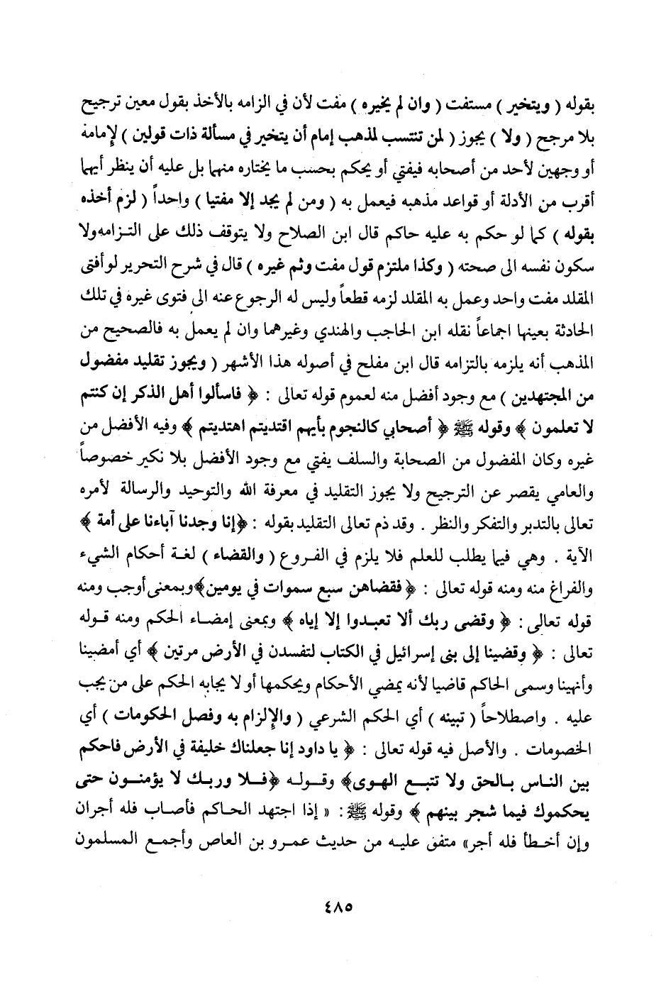 بِقَوْلِهِ (وَيَتَخَيَّرُ) مُسْتَفْتٍ (وَإِنْ لَمْ يُخَيِّرْهُ) مُفْتٍ لِأَنَّ فِي إلْزَامِهِ بِالْأَخْذِ بِقَوْلٍ مُعَيَّنٍ تَرْجِيحٌ بِلَا مُرَجِّحٍ (وَلَا) يَجُوزُ (لِمَنْ يَنْتَسِبُ لِمَذْهَبِ إمَامٍ أَنْ يَتَخَيَّرَ فِي مَسْأَلَةٍ ذَاتِ قَوْلَيْنِ) لِإِمَامَةٍ أَوْ وَجْهَيْنِ لِأَحَدٍ مِنْ أَصْحَابِهِ فَيُفْتِي أَوْ يَحْكُمُ بِحَسَبِ مَا يَخْتَارُهُ مِنْهُمَا بَلْ عَلَيْهِ أَنْ يَنْظُرَ أَيُّهُمَا أَقْرَبُ مِنْ الْأَدِلَّةِ أَوْ قَوَاعِدِ مَذْهَبِهِ فَيَعْمَلُ بِهِ