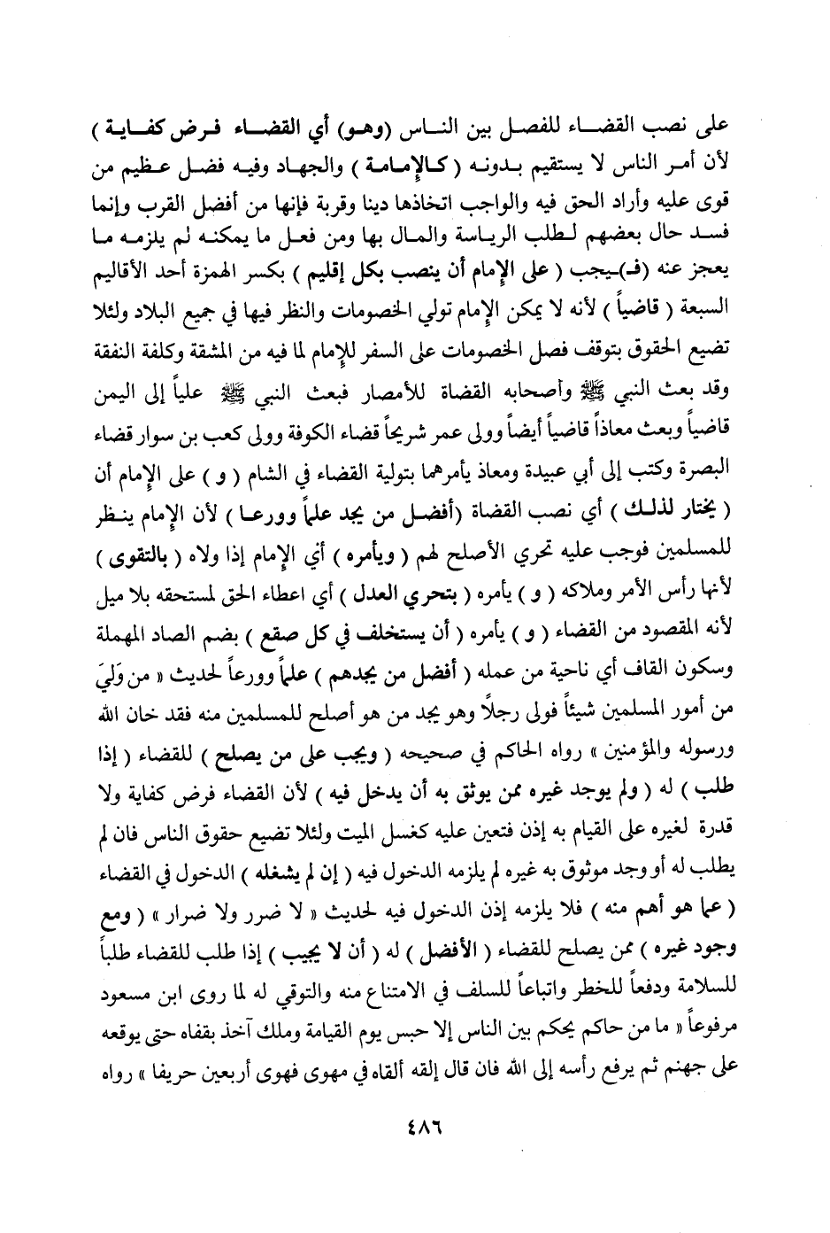 عَلَى نَصْبِ الْقَضَاءِ لِلْفَصْلِ بَيْنَ النَّاسِ (وَهُوَ) أَيْ: الْقَضَاءُ (فَرْضُ كِفَايَةٍ) لِأَنَّ أَمْرَ النَّاسِ لَا يَسْتَقِيمُ بِدُونِهِ (كَالْإِمَامَةِ) وَالْجِهَادِ وَفِيهِ فَضْلٌ عَظِيمٌ لِمَنْ قَوِيَ عَلَيْهِ وَأَرَادَ الْحَقَّ فِيهِ وَالْوَاجِبُ اتِّخَاذُهَا دِينًا وَقُرْبَةً فَإِنَّهَا مِنْ أَفْضَلِ الْقُرَبِ وَإِنَّمَا فَسَدَ حَالُ بَعْضِهِمْ لِطَلَبِ الرِّيَاسَةِ وَالْمَالِ بِهَا وَمِنْ فِعْلِ مَا يُمَكِّنُهُ لَمْ يَلْزَمْهُ مَا يَعْجِزُ عَنْهُ (فَ) يَجِبُ (عَلَى الْإِمَامِ أَنْ يَنْصِبَ بِكُلِّ إقْلِيمٍ) بِكَسْرِ الْهَمْزَةِ أَحَدُ الْأَقَالِيمِ السَّبْعَةِ (قَاضِيًا) لِأَنَّهُ لَا يُمْكِنُ لِلْإِمَامِ تَوَلِّي الْخُصُومَاتِ وَالنَّظَرِ فِيهَا فِي جَمِيعِ الْبِلَادِ وَلِئَلَّا تَضِيعَ الْحُقُوقُ بِتَوَقُّفِ فَصْلِ الْخُصُومَاتِ عَلَى السَّفَرِ لِلْإِمَامِ لِمَا فِيهِ مِنْ الْمَشَقَّةِ وَكُلْفَةِ النَّفَقَةِ وَقَدْ بَعَثَ النَّبِيُّ صَلَّى اللَّهُ عَلَيْهِ وَسَلَّمَ وَأَصْحَابُهُ الْقُضَاةَ لِلْأَمْصَارِ فَبَعَثَ النَّبِيُّ صَلَّى اللَّهُ عَلَيْهِ وَسَلَّمَ عَلِيًّا إلَى الْيَمَنِ قَاضِيًا وَبَعَثَ مُعَاذًا قَاضِيًا أَيْضًا وَوَلَّى عُمَرُ شُرَيْحًا قَضَاءَ الْكُوفَةِ وَوَلَّى كَعْبَ بْنَ سَوَّارٍ قَضَاءَ الْبَصْرَةِ وَكَتَبَ إلَى أَبِي عُبَيْدَةَ وَمُعَاذٍ يَأْمُرُهُمَا بِتَوْلِيَةِ الْقَضَاءِ فِي الشَّامِ.