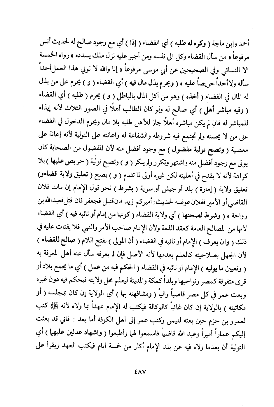 (وَشُرِطَ لِصِحَّتِهَا) أَيْ وِلَايَةِ الْقَضَاءِ (كَوْنُهَا مِنْ إمَامٍ أَوْ نَائِبِهِ فِيهِ) أَيْ: الْقَضَاءِ لِأَنَّهَا مِنْ الْمَصَالِحِ الْعَامَّةِ كَعَقْدِ الذِّمَّةِ وَلِأَنَّ الْإِمَامَ صَاحِبُ الْأَمْرِ وَالنَّهْيِ فَلَا يُفْتَاتُ عَلَيْهِ فِي ذَلِكَ (وَأَنْ يَعْرِفَ) الْإِمَامُ أَوْ نَائِبُهُ فِي الْقَضَاءِ (أَنَّ الْمُوَلَّى) بِفَتْحِ اللَّامِ (صَالِحٌ لِلْقَضَاءِ) لِأَنَّ الْجَهْلَ بِصَلَاحِيَتِهِ كَالْعِلْمِ بِعَدَمِهَا لِأَنَّهُ الْأَصْلُ فَإِنْ لَمْ يَعْرِفْهُ سَأَلَ عَنْهُ أَهْلَ الْمَعْرِفَةِ بِهِ (وَتَعَيَّنَ مَا يُوَلِّيه) الْإِمَامُ أَوْ نَائِبُهُ فِي الْقَضَاءِ (الْحُكْمَ فِيهِ مِنْ عَمَلٍ) أَيْ: مَا يَجْمَعُ بِلَادًا أَوْ قُرًى مُتَفَرِّقَةً كَمِصْرِ وَنَوَاحِيهَا وَبَلَدًا كَمَكَّةَ وَالْمَدِينَةِ لِيَعْلَمَ مَحَلَّ وِلَايَتِهِ فَيَحْكُمَ فِيهِ دُونَ غَيْرِهِ وَبَعَثَ عُمَرُ فِي كُلِّ مِصْرٍ قَاضِيًا وَالِيًا (وَمُشَافَهَتُهُ بِهَا) أَيْ: الْوِلَايَةِ إنْ كَانَ بِمَجْلِسِهِ (أَوْ مُكَاتَبَتُهُ) بِالْوِلَايَةِ إنْ كَانَ غَائِبًا كَالْوَكَالَةِ فَيَكْتُبُ لَهُ الْإِمَامُ عَهْدًا بِمَا وَلَّاهُ لِأَنَّهُ صَلَّى اللَّهُ عَلَيْهِ وَسَلَّمَ كَتَبَ لِعَمْرِو بْنِ حَزْمٍ حِينَ بَعَثَهُ لِلْيَمَنِ وَكَتَبَ عُمَرُ إلَى أَهْلِ الْكُوفَةِ أَمَّا بَعْدُ: فَإِنِّي قَدْ بَعَثْت إلَيْكُمْ عَمَّارًا أَمِيرًا وَعَبْدَ اللَّهِ قَاضِيًا فَاسْمَعُوا لَهُمَا وَأَطِيعُوا (وَإِشْهَادُ عَدْلَيْنِ عَلَيْهِمَا) أَيْ: التَّوْلِيَةِ إنْ بَعُدَ مَا وَلَّاهُ فِيهِ عَنْ بَلَدِ الْإِمَامِ أَكْثَرَ مِنْ خَمْسَةِ أَيَّامٍ فَيَكْتُبُ الْعَهْدَ وَيَقْرَأُ عَلَى