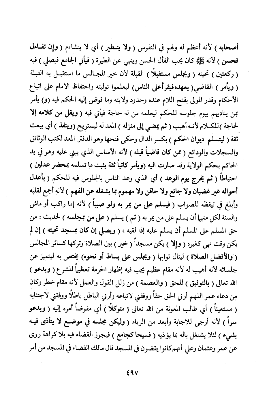 (وَيُنْفِذُ) أَيْ: يَبْعَثُ ثِقَةً (لِيَتَسَلَّمَ دِيوَانَ الْحُكْمِ) بِكَسْرِ الدَّالِ وَحُكِيَ فَتْحُهَا وَهُوَ الدَّفْتَرُ الْمُعَدُّ لِكَتْبِ الْوَثَائِقِ وَالسِّجِلَّاتِ وَالْوَدَائِعِ (مِمَّنْ كَانَ قَاضِيًا قَبْلَهُ) لِأَنَّهُ الْأَسَاسُ الَّذِي يَبْنِي عَلَيْهِ وَهُوَ فِي يَدِ الْحَاكِمِ بِحُكْمِ الْوِلَايَةِ وَقَدْ صَارَتْ إلَيْهِ (وَيَأْمُرُ كَاتِبًا ثِقَةً يُثْبِتُ مَا تَسَلَّمَهُ بِمَحْضَرِ عَدْلَيْنِ) احْتِيَاطًا (ثُمَّ يَخْرُجُ يَوْمَ الْوَعْدِ) أَيْ: الَّذِي وَعَدَ النَّاسِ بِالْجُلُوسِ فِيهِ لِلْحُكْمِ (بِأَعْدَلِ أَحْوَالِهِ غَيْرَ غَضْبَانَ وَلَا جَائِعٍ وَلَا حَاقِنٍ وَلَا مَهْمُومٍ بِمَا يَشْغَلُهُ عَنْ الْفَهْمِ) لِأَنَّهُ أَجْمَعُ لِقَلْبِهِ وَأَبْلَغُ فِي تَيَقُّظِهِ لِلصَّوَابِ (فَيُسَلِّمُ عَلَى مَنْ يَمُرُّ بِهِ وَلَوْ صَبِيًّا) لِأَنَّهُ إمَّا رَاكِبٌ أَوْ مَاشٍ وَالسُّنَّةُ لِكُلٍّ مِنْهُمَا أَنْ يُسَلِّمَ عَلَى مَنْ يَمُرُّ بِهِ (ثُمَّ) يُسَلِّمُ (عَلَى مَنْ بِمَجْلِسِهِ) لِحَدِيثِ " «مِنْ حَقِّ الْمُسْلِمِ عَلَى الْمُسْلِمِ أَنْ يُسَلِّمَ عَلَيْهِ إذَا لَقِيَهُ» " (وَيُصَلِّي إنْ كَانَ بِمَسْجِدٍ تَحِيَّتَهُ) إنْ لَمْ يَكُنْ وَقْتَ نَهْيٍ كَغَيْرِهِ (وَإِلَّا) يَكُنْ مَسْجِدًا (خُيِّرَ) بَيْنَ الصَّلَاةِ وَتَرْكِهَا كَسَائِرِ الْمَجَالِسِ (وَالْأَفْضَلُ الصَّلَاةُ) لِيَنَالَ ثَوَابَهَا (وَيَجْلِسُ عَلَى بِسَاطٍ أَوْ نَحْوِهِ) يَخْتَصُّ بِهِ لِيَتَمَيَّزَ عَنْ جُلَسَائِهِ لِأَنَّهُ أَهْيَبُ لَهُ لِأَنَّهُ مَقَامٌ عَظِيمٌ يَجِبُ فِيهِ إظْهَارُ الْحُرْمَةِ تَعْظِيمًا لِلشَّرْعِ (وَيَدْعُو) اللَّهَ تَعَالَى (بِالتَّوْفِيقِ) لِلْحَقِّ (وَالْعِصْمَةِ) مِنْ زَلَلِ الْقَوْلِ وَالْعَمَلِ لِأَنَّهُ مَقَامُ خَطَرٍ وَكَانَ مَنْ دُعَاءِ عُمَرَ اللَّهُمَّ أَرِنِي الْحَقَّ حَقًّا وَوَفِّقْنِي لِاتِّبَاعِهِ وَأَرِنِي الْبَاطِلَ بَاطِلًا وَوَفِّقْنِي لِاجْتِنَابِهِ (مُسْتَعِينًا) أَيْ: طَالِبًا الْمَعُونَةَ مِنْ اللَّهِ تَعَالَى (مُتَوَكِّلًا) أَيْ: مُفَوِّضًا أَمْرَهُ إلَيْهِ (وَيَدْعُو سِرًّا) لِأَنَّهُ أَرْجَى لِلْإِجَابَةِ وَأَبْعَدُ مِنْ الرِّيَاءِ (وَلْيَكُنْ مَجْلِسُهُ فِي مَوْضِعٍ لَا يَتَأَذَّى فِيهِ بِشَيْءٍ) لِئَلَّا يَشْتَغِلَ بَالُهُ بِمَا يُؤْذِيهِ (فَسِيحًا كَجَامِعٍ) فَيَجُوزُ الْقَضَاءُ فِيهِ بِلَا كَرَاهَةٍ رُوِيَ عَنْ عُمَرَ وَعُثْمَانَ وَعَلِيٍّ أَنَّهُمْ كَانُوا يَقْضُونَ فِي الْمَسْجِدِ.
