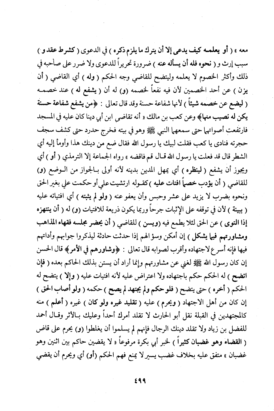 (وَيُسَنُّ) لِلْقَاضِي (أَنْ يُحْضِرَ مَجْلِسَهُ فُقَهَاءَ الْمَذَاهِبِ وَمُشَاوَرَتُهُمْ فِيمَا يَشْكُلُ) إنْ أَمْكَنَ وَسُؤَالُهُمْ إذَا حَدَثَتْ حَادِثَةٌ لِيَذْكُرُوا جَوَابَهُمْ وَأَدَاتَهُمْ فِيهَا فَإِنَّهُ أَسْرَعُ لِاجْتِهَادِهِ وَأَقْرَبُ لِصَوَابِهِ قَالَ تَعَالَى: {وَشَاوِرْهُمْ فِي الْأَمْرِ} [آل عمران: ١٥٩] قَالَ الْحَسَنُ إنْ كَانَ رَسُولُ اللَّهِ صَلَّى اللَّهُ عَلَيْهِ وَسَلَّمَ لَغَنِيٌّ عَنْ مُشَاوَرَتِهِمْ وَإِنَّمَا أَرَادَ أَنْ يَسْتَنَّ بِذَلِكَ الْحَاكِمُ بَعْدَهُ (فَإِنْ اتَّضَحَ) لَهُ الْحُكْمُ حَكَمَ بِاجْتِهَادِهِ وَلَا اعْتِرَاضَ عَلَيْهِ لِأَنَّهُ افْتِيَاتٌ عَلَيْهِ (وَإِلَّا) يَتَّضِحْ لَهُ الْحُكْمُ (أَخَّرَهُ) حَتَّى يَتَّضِحَ (فَلَوْ حَكَمَ وَلَمْ يَجْتَهِدْ لَمْ يَصِحَّ) حُكْمُهُ (وَلَوْ أَصَابَ الْحَقَّ) إنْ كَانَ مِنْ أَهْلِ الِاجْتِهَادِ