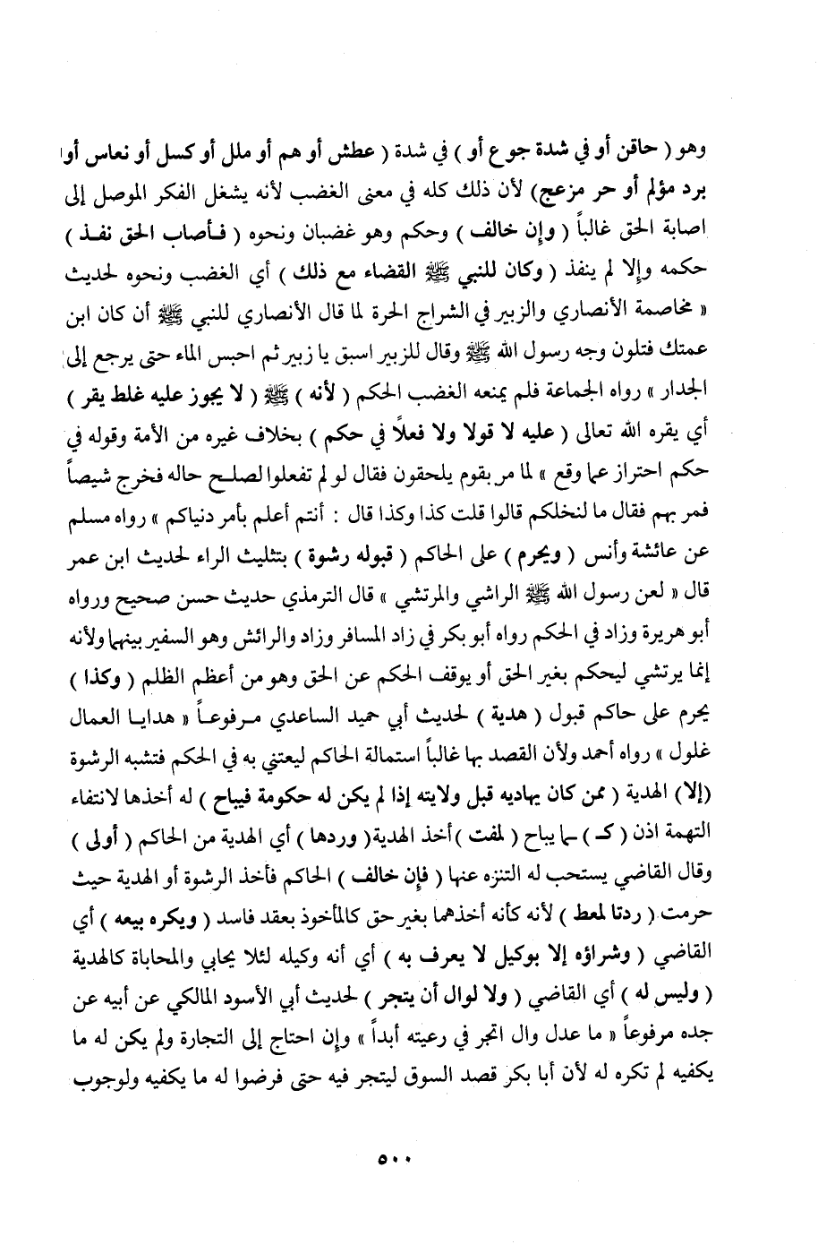 وَهُوَ (حَاقِنٌ أَوْ فِي شِدَّةِ جُوعٍ أَوْ) فِي شِدَّةِ (عَطَشٍ أَوْ هَمٍّ أَوْ مَلَلٍ أَوْ كَسَلٍ أَوْ نُعَاسٍ أَوْ بَرْدٍ مُؤْلِمٍ أَوْ حَرٍّ مُزْعِجٍ) لِأَنَّ ذَلِكَ كُلَّهُ فِي مَعْنَى الْغَضَبِ لِأَنَّهُ يَشْغَلُ الْفِكْرَ الْمُوصِلَ إلَى إصَابَةِ الْحَقِّ غَالِبًا (وَإِنْ خَالَفَ) وَحَكَمَ وَهُوَ غَضْبَان وَنَحْوُهُ (فَأَصَابَ الْحَقَّ نَفَذَ) حُكْمُهُ وَإِلَّا لَمْ يَنْفُذْ (وَكَانَ لِلنَّبِيِّ صَلَّى اللَّهُ عَلَيْهِ وَسَلَّمَ الْقَضَاءُ مَعَ ذَلِكَ) أَيْ: الْغَضَبِ وَنَحْوِهِ لِحَدِيثِ مُخَاصَمَةِ الْأَنْصَارِيِّ وَالزُّبَيْرِ فِي الشِّرَاجِ الْحُرَّةِ لَمَّا قَالَ الْأَنْصَارِيُّ لِلنَّبِيِّ صَلَّى اللَّهُ عَلَيْهِ وَسَلَّمَ أَنْ كَانَ ابْنَ عَمَّتِكَ فَتَلَوَّنَ وَجْهُ رَسُولِ اللَّهِ صَلَّى اللَّهُ عَلَيْهِ وَسَلَّمَ وَقَالَ لِلزُّبَيْرِ: " اسْبِقْ يَا زُبَيْرُ ثُمَّ احْبِسْ الْمَاءَ حَتَّى يَرْجِعَ إلَى الْجِدَارِ " رَوَاهُ الْجَمَاعَةُ فَلَمْ يَمْنَعْهُ الْغَضَبُ الْحُكْمَ (لِأَنَّهُ) صَلَّى اللَّهُ عَلَيْهِ وَسَلَّمَ (لَا يَجُوزُ عَلَيْهِ غَلَطٌ يُقَرُّ) أَيْ: يُقِرُّهُ اللَّهُ تَعَالَى (عَلَيْهِ لَا قَوْلًا وَلَا فِعْلًا فِي حُكْمٍ) بِخِلَافِ غَيْرِهِ مِنْ الْأُمَّةِ، وَقَوْلُهُ فِي حُكْمٍ احْتِرَازٌ عَمَّا وَقَعَ لَمَّا «مَرَّ بِقَوْمٍ يُلَقِّحُونَ فَقَالَ لَوْ لَمْ تَفْعَلُوا لَصَلَحَ حَالُهُ فَخَرَجَ شِيصًا فَمَرَّ بِهِمْ فَقَالَ: مَا لِنَخْلِكُمْ؟ قَالُوا: قُلْتَ كَذَا وَكَذَا قَالَ: أَنْتُمْ أَعْلَمُ بِأَمْرِ دُنْيَاكُمْ» " رَوَاهُ مُسْلِمٌ عَنْ عَائِشَةَ وَأَنَسٍ