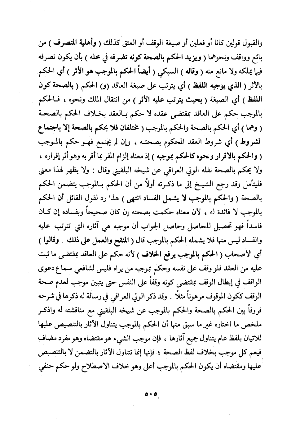 وَقَالُوا) أَيْ الْأَصْحَابُ: (الْحُكْمُ بِالْمُوجَبِ يَرْفَعُ الْخِلَافَ) ; لِأَنَّهُ حُكْمٌ عَلَى الْعَاقِدِ بِمُقْتَضَى مَا ثَبَتَ عَلَيْهِ مِنْ الْعَقْدِ، فَلَوْ وَقَفَ عَلَى نَفْسِهِ وَحَكَمَ بِمُوجَبِهِ مَنْ يَرَاهُ فَلَيْسَ لِشَافِعِيٍّ سَمَاعُ دَعْوَى الْوَاقِفِ فِي إبْطَالِ الْوَقْفِ بِمُقْتَضَى كَوْنِهِ وَقْفًا عَلَى النَّفْسِ، حَتَّى يَتَبَيَّنَ مُوجَبٌ لِعَدَمِ صِحَّةِ الْوَقْفِ كَكَوْنِ الْمَوْقُوفِ مَرْهُونًا مَثَلًا. وَقَدْ ذَكَرَ الْوَلِيُّ الْعِرَاقِيُّ فِي رِسَالَةٍ لَهُ ذَكَرَهَا فِي شَرْحِهِ فُرُوقًا بَيْنَ الْحُكْمِ بِالصِّحَّةِ وَالْحُكْمِ بِالْمُوجَبِ عَنْ شَيْخِهِ الْبُلْقِينِيِّ مَعَ مُنَاقَشَتِهِ لَهُ، وَذَكَرَ مُلَخَّصَ مَا اخْتَارَهُ غَيْرَ مَا سَبَقَ مِنْهَا أَنَّ الْحُكْمَ بِالْمُوجَبِ يَتَنَاوَلُ الْآثَارَ بِالتَّنْصِيصِ عَلَيْهَا لِلْإِتْيَانِ بِلَفْظٍ عَامٍّ يَتَنَاوَلُ جَمِيعَ آثَارِهَا، فَإِنَّ مُوجَبَ الشَّيْءِ هُوَ مُقْتَضَاهُ، وَهُوَ مُفْرَدٌ مُضَافٌ فَيَعُمُّ كُلَّ مُوجَبٍ بِخِلَافِ لَفْظِ الصِّحَّةِ ; فَإِنَّهَا إنَّمَا تَتَنَاوَلُ الْآثَارَ بِالتَّضَمُّنِ لَا بِالتَّنْصِيصِ عَلَيْهَا، وَمُقْتَضَاهُ أَنْ يَكُونَ الْحُكْمُ بِالْمُوجَبِ أَعْلَى، وَهُوَ خِلَافُ الِاصْطِلَاحِ، وَلَوْ حَكَمَ حَنَفِيٌّ
