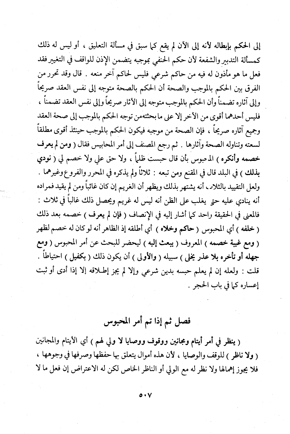 فَصْلٌ ثُمَّ إذَا تَمَّ أَمْرُ الْمَحْبُوسِ (يُنْظَرُ فِي أَمْرِ أَيْتَامٍ وَمَجَانِينَ وَوُقُوفٍ وَوَصَايَا لَا وَلِيَّ لَهُمْ) أَيْ: الْأَيْتَامِ وَالْمَجَانِينِ (وَلَا نَاظِرَ) لِلْوَقْفِ وَالْوَصَايَا ; لِأَنَّ هَذِهِ أَمْوَالٌ يَتَعَلَّقُ بِهَا حِفْظُهَا وَصَرْفُهَا فِي وُجُوهِهَا، فَلَا يَجُوزُ إهْمَالُهَا، وَلَا نَظَرَ لَهُ مَعَ الْوَلِيِّ أَوْ النَّاظِرِ الْخَاصِّ، لَكِنْ لَهُ الِاعْتِرَاضُ إنْ فَعَلَ مَا لَا