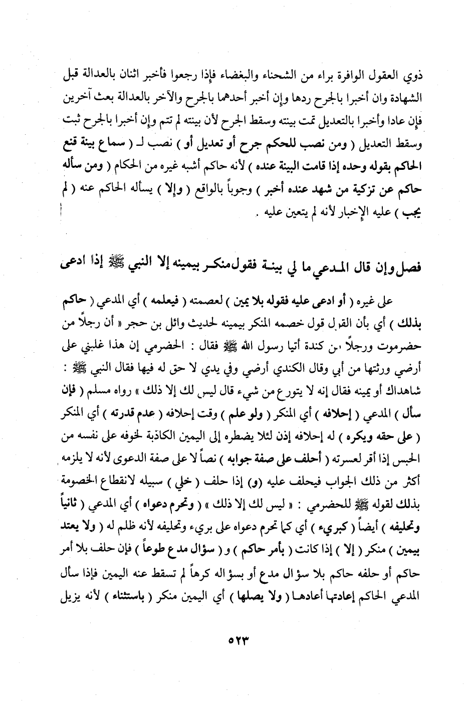 فَصْلٌ وَإِنْ قَالَ الْمُدَّعِي مَا لِي بَيِّنَةٌ فَقَوْلُ مُنْكِرٍ بِيَمِينِهِ إلَّا النَّبِيَّ صَلَّى اللَّهُ عَلَيْهِ وَسَلَّمَ إذَا ادَّعَى عَلَى غَيْرِهِ (أَوْ اُدُّعِيَ عَلَيْهِ، فَقَوْلُهُ بِلَا يَمِينٍ) لِعِصْمَتِهِ (فَيُعْلِمُهُ) أَيْ الْمُدَّعِيَ (حَاكِمٌ بِذَلِكَ) أَيْ بِأَنَّ الْقَوْلَ قَوْلُ خَصْمِهِ الْمُنْكِرِ بِيَمِينِهِ لِحَدِيثِ وَائِلِ بْنِ حُجْرٌ: " «أَنَّ رَجُلًا مِنْ حَضْرَمَوْتَ وَرَجُلًا مِنْ كِنْدَةَ أَتَيَا رَسُولَ اللَّهِ صَلَّى اللَّهُ عَلَيْهِ وَسَلَّمَ فَقَالَ الْحَضْرَمِيُّ: إنَّ هَذَا غَلَبَنِي عَلَى أَرْضِي وَرِثْتُهَا مِنْ أَبِي، وَقَالَ الْكِنْدِيُّ أَرْضِي وَفِي يَدِي لَا حَقَّ لَهُ فِيهَا فَقَالَ النَّبِيُّ صَلَّى اللَّهُ عَلَيْهِ وَسَلَّمَ: شَاهِدَاكَ أَوْ يَمِينُهُ. فَقَالَ: إنَّهُ لَا يَتَوَرَّعُ مِنْ شَيْءٍ قَالَ: لَيْسَ لَكَ إلَّا ذَلِكَ» رَوَاهُ مُسْلِمٌ