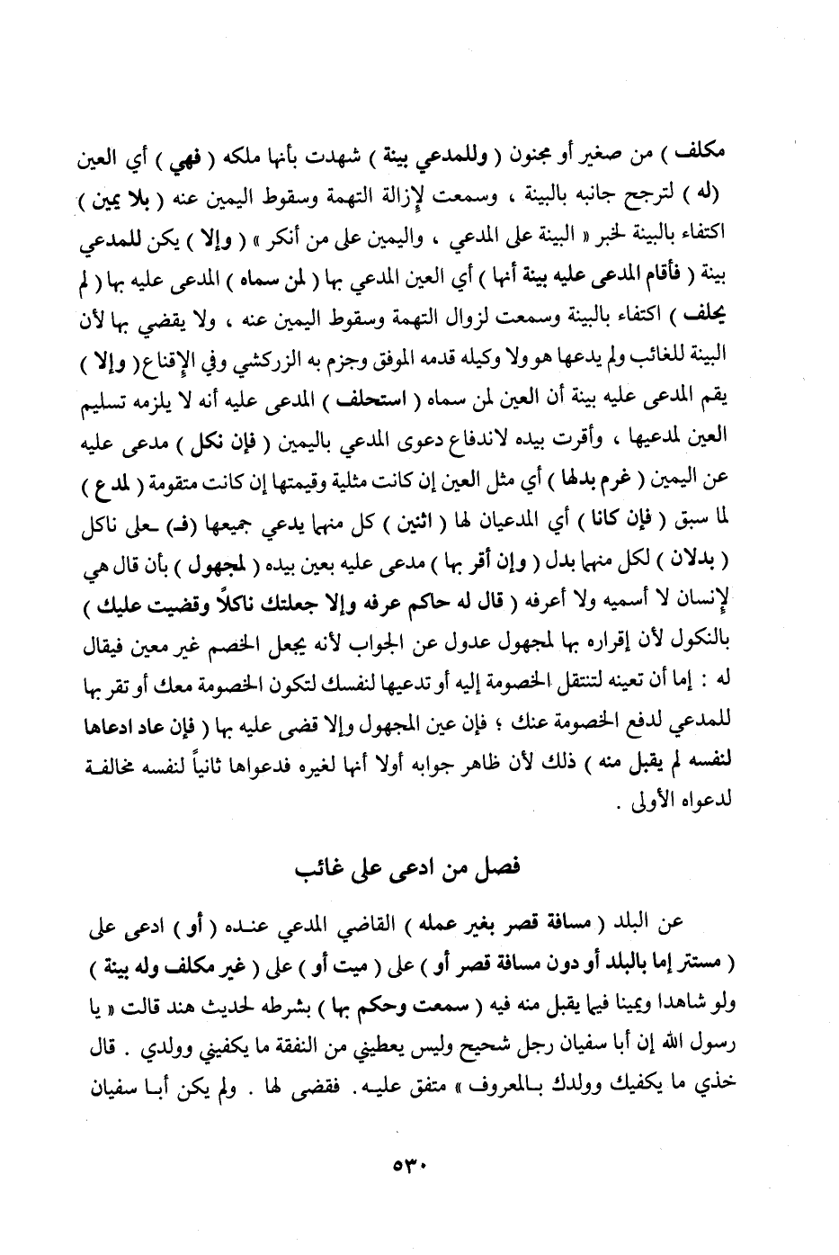 (فَصْلٌ مَنْ ادَّعَى عَلَى غَائِبٍ) عَنْ الْبَلَدِ (مَسَافَةَ قَصْرٍ بِغَيْرِ عَمَلِهِ) الْقَاضِي الْمُدَّعَى عِنْدَهُ (أَوْ) ادَّعَى عَلَى (مُسْتَتِرٍ إمَّا بِالْبَلَدِ أَوْ دُونَ مَسَافَةِ قَصْرٍ أَوْ) عَلَى (مَيِّتٍ أَوْ) عَلَى (غَيْرِ مُكَلَّفٍ وَلَهُ بَيِّنَةٌ) ، وَلَوْ شَاهِدًا وَيَمِينًا فِيمَا يُقْبَلُ مِنْهُ فِيهِ (سُمِعَتْ وَحُكِمَ بِهَا) بِشَرْطِهِ لِحَدِيثِ هِنْدٍ قَالَتْ: " «يَا رَسُولَ اللَّهِ إنَّ أَبَا سُفْيَانَ رَجُلٌ شَحِيحٌ وَلَيْسَ يُعْطِينِي مِنْ النَّفَقَةِ مَا يَكْفِينِي وَوَلَدِي. قَالَ: خُذِي مَا يَكْفِيكِ وَوَلَدَكِ بِالْمَعْرُوفِ» " مُتَّفَقٌ عَلَيْهِ. فَقَضَى لَهَا. وَلَمْ يَكُنْ أَبُو سُفْيَانَ