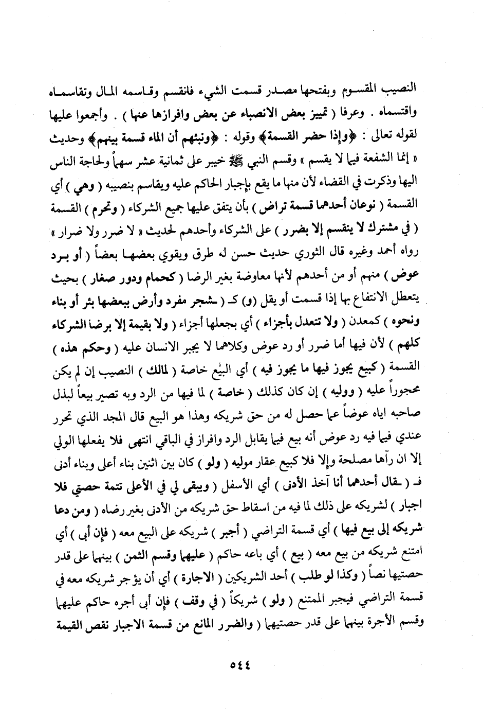 قَالَ الثَّوْرِيُّ: حَدِيثٌ حَسَنٌ لَهُ طُرُقٌ وَيُقَوِّي بَعْضُهَا بَعْضًا (أَوْ بِرَدِّ عِوَضٍ) مِنْهُمْ أَوْ مِنْ أَحَدِهِمْ ; لِأَنَّهَا مُعَاوَضَةٌ بِغَيْرِ الرِّضَا (كَحَمَّامٍ وَدُورٍ صِغَارٍ) بِحَيْثُ يَتَعَطَّلُ الِانْتِفَاعُ بِهَا، إذَا قُسِّمَتْ أَوْ يَقِلُّ.