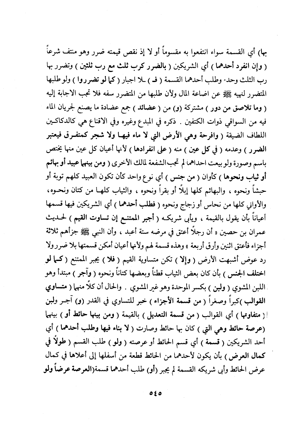 بِهَا) أَيْ الْقِسْمَةِ سَوَاءً انْتَفَعُوا بِهِ مَقْسُومًا أَوْ لَا، إذْ نَقْصُ قِيمَتِهِ ضَرَرٌ وَهُوَ مُنْتَفٍ شَرْعًا، (وَإِنْ انْفَرَدَ أَحَدُهُمَا) أَيْ الشَّرِيكَيْنِ (بِالضَّرَرِ كَرَبِّ ثُلُثٍ مَعَ رَبِّ ثُلُثَيْنِ) وَتَضَرَّرَ بِهَا رَبُّ الثُّلُثِ وَحْدَهُ وَطَلَبَ أَحَدُهُمَا الْقِسْمَةَ، (فَ) لَا إجْبَارَ (كَمَا لَوْ تَضَرَّرُوا) وَلَوْ طَلَبَهَا الْمُتَضَرِّرُ لِنَهْيِهِ صَلَّى اللَّهُ عَلَيْهِ وَسَلَّمَ عَنْ إضَاعَةِ الْمَالِ ; وَلِأَنَّ طَلَبَهَا مِنْ الْمُتَضَرِّرِ سَفَهٌ فَلَا تَجِبُ الْإِجَابَةُ إلَيْهِ