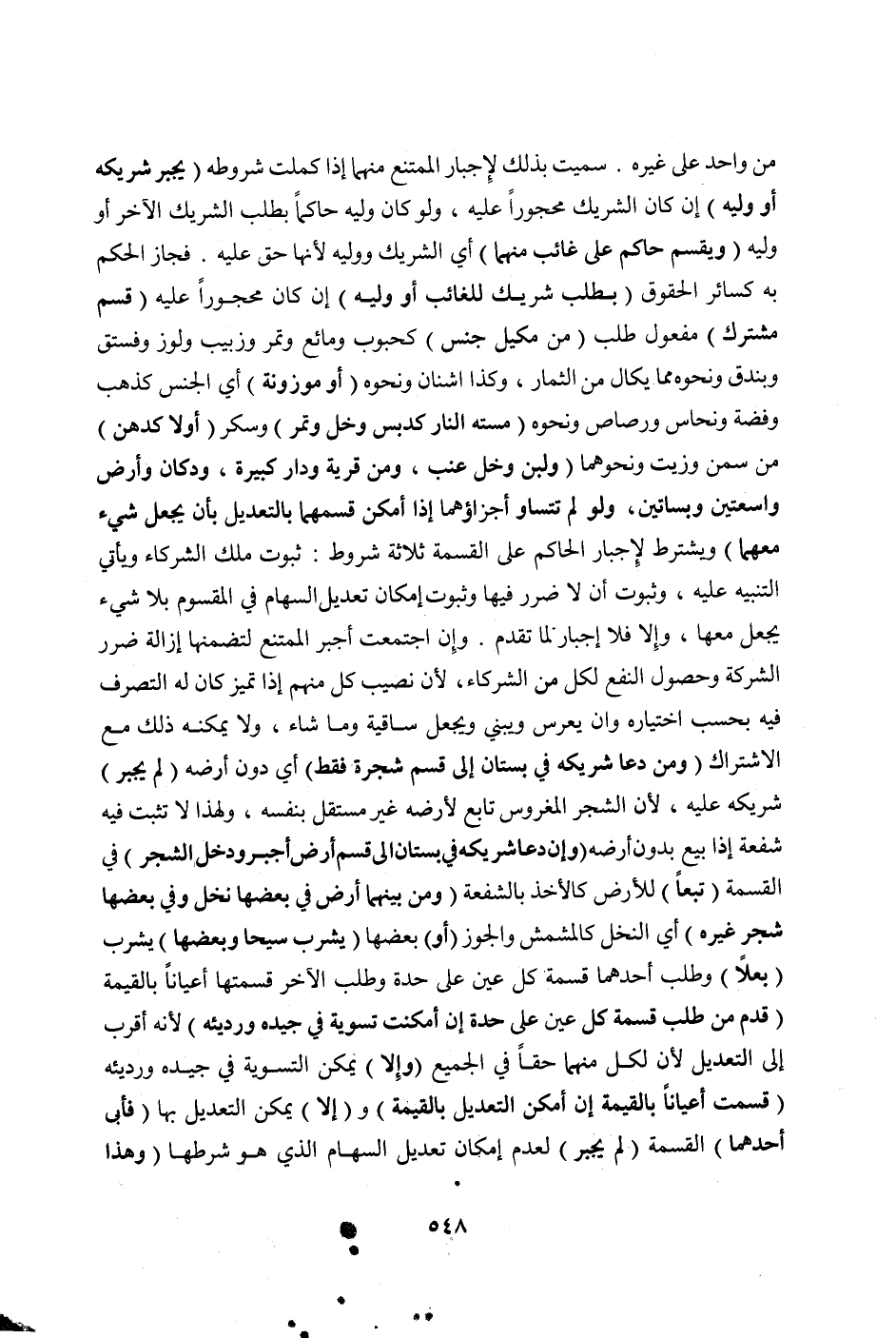 مِنْ وَاحِدٍ عَلَى غَيْرِهِ. سُمِّيَتْ بِذَلِكَ لِإِجْبَارِ الْمُمْتَنِعِ مِنْهُمَا إذَا كَمُلَتْ شُرُوطُهُ (يُجْبِرُ شَرِيكَهُ أَوْ وَلِيَّهُ) إنْ كَانَ الشَّرِيكُ مَحْجُورًا عَلَيْهِ، وَلَوْ كَانَ وَلِيُّهُ حَاكِمًا بِطَلَبِ الشَّرِيكِ الْآخَرِ أَوْ وَلِيِّهِ، (وَيَقْسِمُ حَاكِمٌ عَلَى غَائِبٍ مِنْهُمَا) أَيْ الشَّرِيكِ وَوَلِيِّهِ ; لِأَنَّهَا حَقٌّ عَلَيْهِ. فَجَازَ الْحُكْمُ بِهِ كَسَائِرِ الْحُقُوقِ (بِطَلَبِ شَرِيكٍ لِلْغَائِبِ أَوْ وَلِيِّهِ) إنْ كَانَ مَحْجُورًا عَلَيْهِ (قَسْمَ مُشْتَرَكٍ) مَفْعُولُ طَلَبَ (مِنْ مَكِيلِ جِنْسٍ) كَحُبُوبٍ وَمَائِعٍ وَتَمْرٍ وَزَبِيبٍ وَلَوْزٍ وَفُسْتُقٍ وَبُنْدُقٍ وَنَحْوِهِ مِمَّا يُكَالُ مِنْ الثِّمَارِ، وَكَذَا اثْنَانِ وَنَحْوُهُ (أَوْ مَوْزُونَةٍ) أَيْ الْجِنْسِ كَذَهَبٍ وَفِضَّةٍ وَنُحَاسٍ وَرَصَاصٍ وَنَحْوِهِ (مَسَّتْهُ النَّارُ كَدِبْسٍ وَخَلٍّ وَتَمْرٍ) وَسُكَّرٍ (أَوْ لَا كَدُهْنٍ) مِنْ سَمْنٍ وَزَيْتٍ وَنَحْوِهِمَا (وَلَبَنٍ وَخَلِّ عِنَبٍ، وَمِنْ قَرْيَةٍ وَدَارٍ كَبِيرَةٍ، وَدُكَّانٍ وَأَرْضٍ وَاسِعَتَيْنِ وَبَسَاتِينَ، وَلَوْ لَمْ تَتَسَاوَ أَجْزَاؤُهُمَا إذَا أَمْكَنَ قَسْمُهُمَا بِالتَّعْدِيلِ بِأَنْ يُجْعَلَ شَيْءٌ مَعَهُمَا)