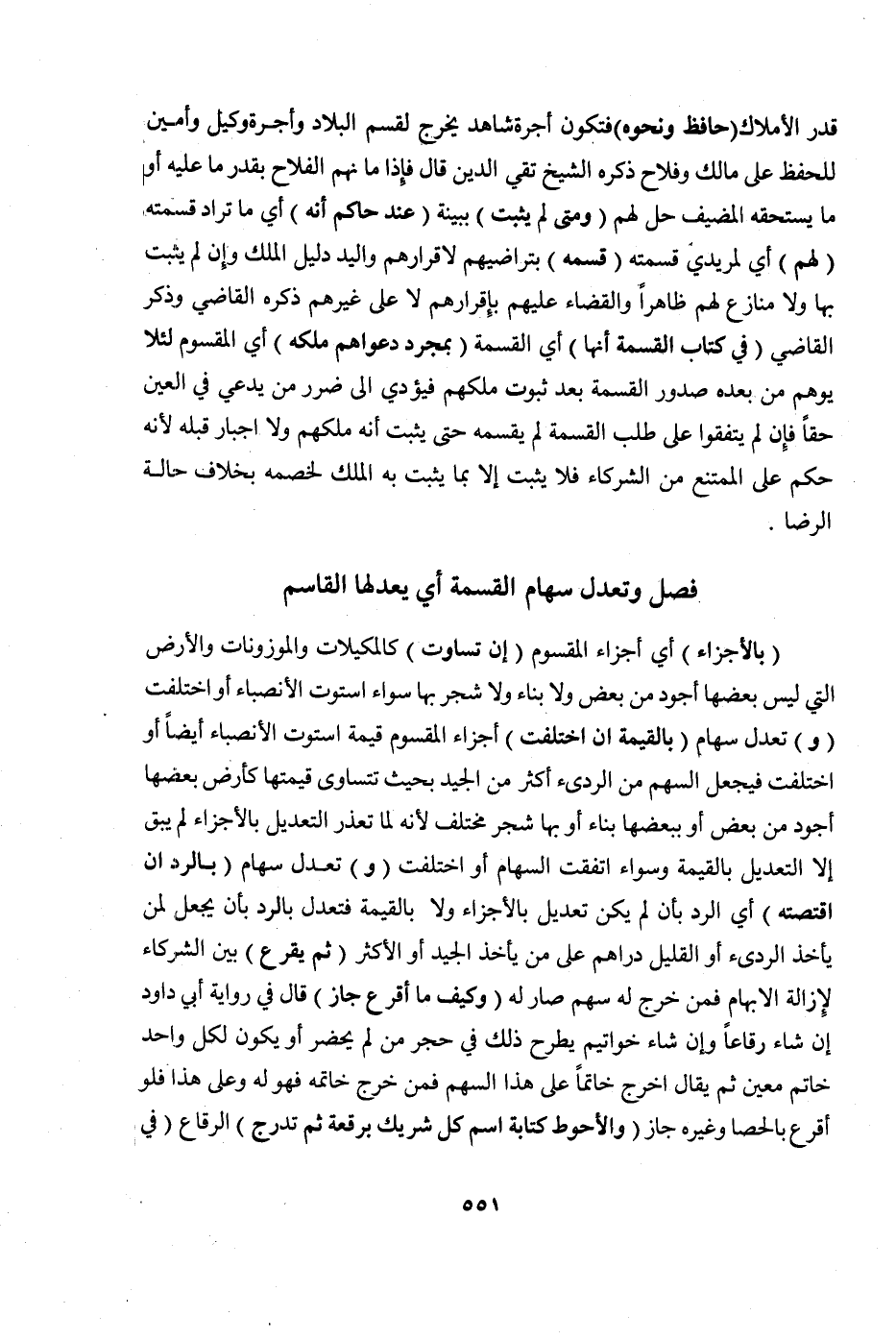 قَدْرِ الْأَمْلَاكِ (حَافِظٍ وَنَحْوُهُ) فَتَكُونُ أُجْرَةَ شَاهِدٍ يَخْرُجُ لِقَسْمِ الْبِلَادِ وَأُجْرَةَ وَكِيلٍ وَأَمِينٍ لِلْحِفْظِ عَلَى مَالِكٍ وَفَلَّاحٍ، ذَكَرَهُ الشَّيْخُ تَقِيُّ الدِّينِ قَالَ: فَإِذَا مَا نُهِمَ الْفَلَّاحُ بِقَدْرِ مَا عَلَيْهِ أَوْ مَا يَسْتَحِقُّهُ الْمُضِيفُ حَلَّ لَهُمْ (وَمَتَى لَمْ يَثْبُتْ) بِبَيِّنَةٍ (عِنْدَ حَاكِمٍ أَنَّهُ) أَيْ مَا تُرَادُ قِسْمَتُهُ (لَهُمْ) أَيْ لِمُرِيدِي قِسْمَتِهِ، (قَسَمَهُ) بِتَرَاضِيهِمْ لِإِقْرَارِهِمْ وَالْيَدُ دَلِيلُ الْمِلْكِ وَإِنْ لَمْ يَثْبُتْ بِهَا وَلَا مُنَازِعَ لَهُمْ ظَاهِرًا وَالْقَضَاءُ عَلَيْهِمْ بِإِقْرَارِهِمْ لَا عَلَى غَيْرِهِمْ، ذَكَرَهُ الْقَاضِي وَذَكَرَ الْقَاضِي (فِي كِتَابِ الْقِسْمَةِ أَنَّهَا) أَيْ الْقِسْمَةَ (بِمُجَرَّدِ دَعْوَاهُمْ مِلْكَهُ) أَيْ الْمَقْسُومِ لِئَلَّا يُوهَمَ مِنْ بَعْدِهِ صُدُورُ الْقِسْمَةِ بَعْدَ ثُبُوتِ مِلْكِهِمْ، فَيُؤَدِّي إلَى ضَرَرِ مَنْ يَدَّعِي فِي الْعَيْنِ حَقًّا، فَإِنْ لَمْ يَتَّفِقُوا عَلَى طَلَبِ الْقِسْمَةِ لَمْ يَقْسِمْهُ حَتَّى يَثْبُتَ أَنَّهُ مِلْكُهُمْ وَلَا إجْبَارَ قَبْلَهُ ; لِأَنَّهُ حُكْمٌ عَلَى الْمُمْتَنِعِ مِنْ الشُّرَكَاءِ فَلَا يَثْبُتُ إلَّا بِمَا يَثْبُتُ بِهِ الْمِلْكُ لِخَصْمِهِ بِخِلَافِ حَالَةِ الرِّضَا.