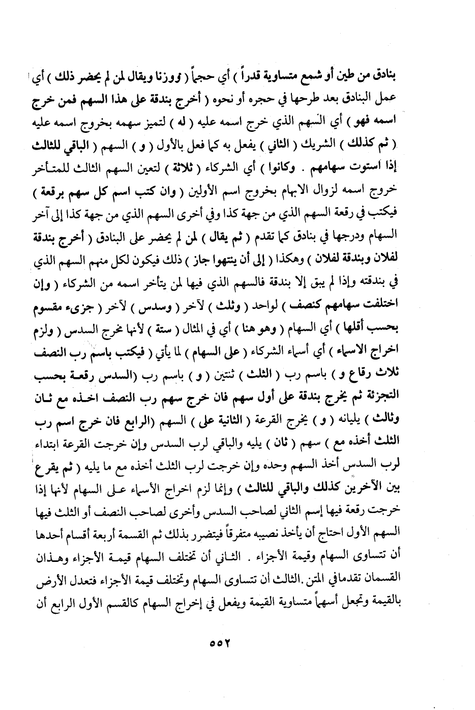 بَنَادِقَ مِنْ طِينٍ أَوْ شَمْعٍ مُتَسَاوِيَةً قَدْرًا) أَيْ حَجْمًا (وَوَزْنًا وَيُقَالُ لِمَنْ لَمْ يَحْضُرْ ذَلِكَ) أَيْ عَمَلَ الْبَنَادِقِ بَعْدَ طَرْحِهَا فِي حِجْرِهِ أَوْ نَحْوِهِ (أَخْرِجْ بُنْدُقَةً عَلَى هَذَا السَّهْمِ فَمَنْ خَرَجَ اسْمُهُ فَهُوَ) أَيْ السَّهْمُ الَّذِي خَرَجَ اسْمُهُ عَلَيْهِ (لَهُ) ، لِتَمَيُّزِ سَهْمِهِ بِخُرُوجِ اسْمِهِ عَلَيْهِ، (ثُمَّ كَذَلِكَ) الشَّرِيكُ (الثَّانِي) يُفْعَلُ بِهِ كَمَا يُفْعَلُ بِالْأَوَّلِ، (وَ) السَّهْمُ (الْبَاقِي لِلثَّالِثِ إذَا اسْتَوَتْ سِهَامُهُمْ.