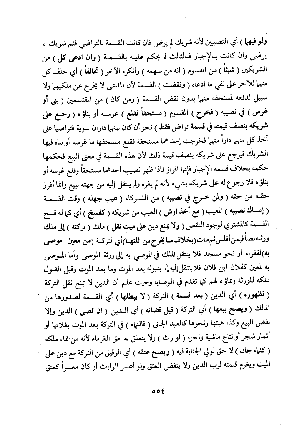 (وَلِمَنْ خَرَجَ فِي نَصِيبِهِ) مِنْ الشُّرَكَاءِ (عَيْبٌ جَهِلَهُ) وَقْتَ الْقِسْمَةِ (إمْسَاكُ نَصِيبِهِ) الْمَعِيبِ (مَعَ أَخْذِ أَرْشِ) الْعَيْبِ مِنْ شَرِيكِهِ (كَفَسْخٍ) أَيْ كَمَا لَهُ فَسْخُ الْقِسْمَةِ كَالْمُشْتَرِي لِوُجُودِ النَّقْصِ، (وَلَا يَمْنَعُ دَيْنٌ عَلَى مَيِّتٍ نَقْلَ) مِلْكِ (تَرِكَتِهِ) إلَى مِلْكِ وَرَثَتِهِ نَصًّا فِيمَنْ أَفْلَسَ ثُمَّ مَاتَ، (بِخِلَافِ مَا يَخْرُجُ مِنْ ثُلُثِهَا) أَيْ التَّرِكَةِ (مِنْ مُعَيَّنٍ مُوصًى بِهِ) لِفُقَرَاءَ أَوْ نَحْوِ مَسْجِدٍ، فَلَا يَنْتَقِلُ الْمِلْكُ فِي الْمُوصَى بِهِ إلَى وَرَثَةِ الْمُوصِي. وَأَمَّا الْمُوصَى بِهِ لِمُعَيَّنٍ كَفُلَانِ ابْنِ فُلَانٍ فَلَا يَنْتَقِلُ إلَيْهِ إلَّا بِقَبُولِهِ بَعْدَ الْمَوْتِ، وَمَا بَعْدَ الْمَوْتِ وَقَبْلَ الْقَبُولِ مِلْكُهُ لِلْوَرَثَةِ وَنَمَاؤُهُ لَهُمْ كَمَا تَقَدَّمَ فِي الْوَصَايَا، وَحَيْثُ عُلِمَ أَنَّ الدَّيْنَ لَا يَمْنَعُ نَقْلَ التَّرِكَةِ (فَظُهُورُهُ) أَيْ الدَّيْنِ (بَعْدَ قِسْمَةِ) التَّرِكَةِ (لَا يُبْطِلُهَا) أَيْ الْقِسْمَةَ لِصُدُورِهَا مِنْ الْمَالِكِ