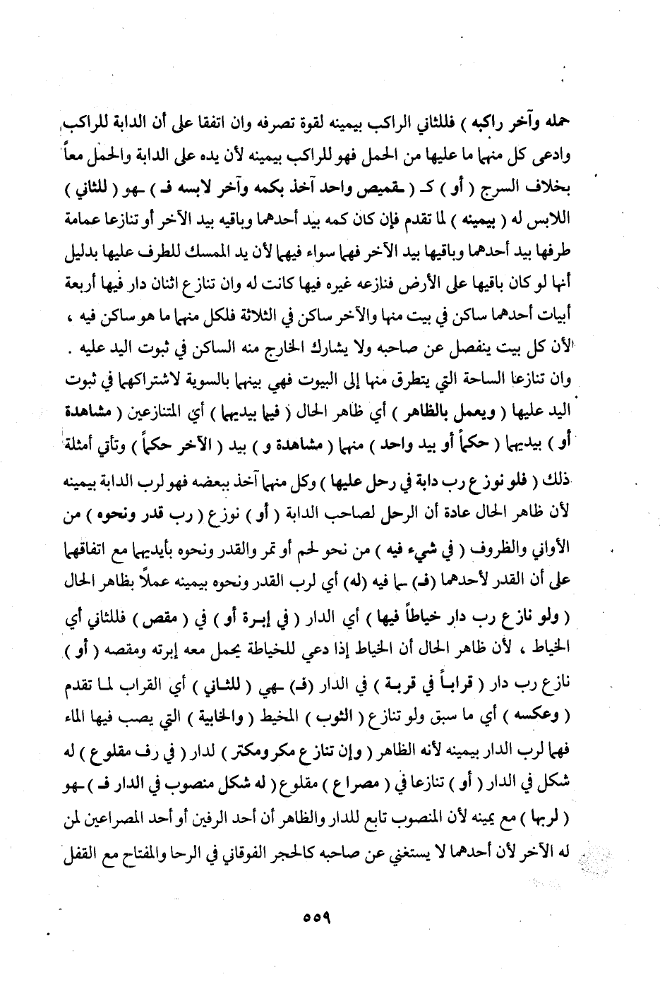 حِمْلُهُ وَآخَرُ رَاكِبُهُ) فَلِلثَّانِي الرَّاكِبِ بِيَمِينِهِ لِقُوَّةِ تَصَرُّفِهِ، وَإِنْ اتَّفَقَا عَلَى أَنَّ الدَّابَّةَ لِلرَّاكِبِ وَادَّعَى كُلٌّ مِنْهُمَا مَا عَلَيْهَا مِنْ الْحِمْلِ فَهُوَ لِلرَّاكِبِ بِيَمِينِهِ ; لِأَنَّ يَدَهُ عَلَى الدَّابَّةِ وَالْحِمْلِ مَعًا بِخِلَافِ السَّرْجِ، (أَوْ) ك (قَمِيصٍ وَاحِدٌ آخِذٌ بِكُمِّهِ وَآخَرُ لَابِسُهُ فَ) هُوَ (لِلثَّانِي) اللَّابِسِ لَهُ (بِيَمِينِهِ) لِمَا تَقَدَّمَ، فَإِنْ كَانَ كُمَّهُ بِيَدِ أَحَدِهِمَا وَبَاقِيهِ بِيَدِ الْآخَرِ، أَوْ تَنَازَعَا عِمَامَةً طَرَفُهَا بِيَدِ أَحَدِهِمَا وَبَاقِيهَا بِيَدِ الْآخَرِ فَهُمَا سَوَاءٌ فِيهِمَا ; لِأَنَّ يَدَ الْمُمْسِكِ لِلطَّرَفِ عَلَيْهَا بِدَلِيلِ أَنَّهَا لَوْ كَانَ بَاقِيهَا عَلَى الْأَرْضِ فَنَازَعَهُ غَيْرُهُ فِيهَا كَانَتْ لَهُ، وَإِنْ تَنَازَعَ اثْنَانِ دَارًا فِيهَا أَرْبَعَةُ أَبْيَاتٍ أَحَدُهُمَا سَاكِنٌ فِي بَيْتٍ مِنْهَا وَالْآخَرُ سَاكِنٌ فِي الثَّلَاثَةِ فَلِكُلٍّ مِنْهُمَا مَا هُوَ سَاكِنٌ فِيهِ ; لِأَنَّ كُلَّ بَيْتٍ يَنْفَصِلُ عَنْ صَاحِبِهِ وَلَا يُشَارِكُ الْخَارِجُ مِنْهُ السَّاكِنَ فِي ثُبُوتِ الْيَدِ عَلَيْهِ، وَإِنْ تَنَازَعَا السَّاحَةَ الَّتِي يَتَطَرَّقُ مِنْهَا إلَى الْبُيُوتِ فَهِيَ بَيْنَهُمَا بِالسَّوِيَّةِ لِاشْتِرَاكِهِمَا فِي ثُبُوتِ الْيَدِ عَلَيْهَا.