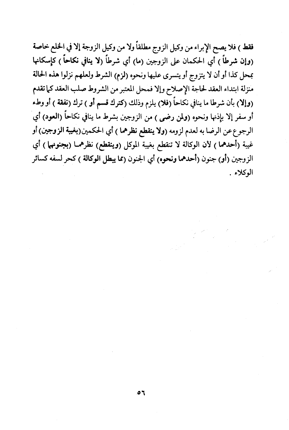فَقَطْ) فَلَا يَصِحُّ الْإِبْرَاءُ مِنْ وَكِيلِ الزَّوْجِ مُطْلَقًا وَلَا مِنْ وَكِيلِ الزَّوْجَةِ إلَّا فِي الْخُلْعِ خَاصَّةً. (وَإِنْ شَرَطَا) أَيْ: الْحَكَمَانِ عَلَى الزَّوْجَيْنِ (مَا) أَيْ: شَرَطًا (لَا يُنَافِي نِكَاحًا) كَإِسْكَانِهَا بِمَحَلِّ كَذَا أَوْ أَنْ لَا يَتَزَوَّجَ أَوْ يَتَسَرَّى عَلَيْهَا وَنَحْوَهُ (لَزِمَ) الشَّرْطُ وَلَعَلَّهُمْ نَزَّلُوا هَذِهِ الْحَالَةَ مَنْزِلَةَ ابْتِدَاءِ الْعَقْدِ لِحَاجَةِ الْإِصْلَاحِ وَإِلَّا فَمَحَلُّ الْمُعْتَبَرِ مِنْ الشُّرُوطِ صُلْبُ الْعَقْدِ كَمَا تَقَدَّمَ (وَإِلَّا) بِأَنْ شَرَطَا مَا يُنَافِي نِكَاحًا (فَلَا) يَلْزَمُ، وَذَلِكَ (كَتَرْكِ قَسْمٍ أَوْ) تَرْكِ (نَفَقَةٍ) أَوْ وَطْءٍ أَوْ سَفَرٍ إلَّا بِإِذْنِهَا وَنَحْوِهِ. (وَلِمَنْ رَضِيَ) مِنْ الزَّوْجَيْنِ بِشَرْطِ مَا يُنَافِي نِكَاحًا (الْعَوْدَ) أَيْ: الرُّجُوعَ عَنْ الرِّضَا بِهِ لِعَدَمِ لُزُومِهِ (وَلَا يَنْقَطِعُ نَظَرُهُمَا) أَيْ: الْحَكَمَيْنِ (بِغَيْبَةِ الزَّوْجَيْنِ) أَوْ غَيْبَةِ (أَحَدِهِمَا) ; لِأَنَّ الْوَكَالَةَ لَا تَنْقَطِعُ بِغَيْبَةِ الْمُوَكِّلِ (، وَيَنْقَطِعُ) نَظَرُهُمَا (بِجُنُونِهِمَا) أَيْ: الزَّوْجَيْنِ (أَوْ) جُنُونِ (أَحَدِهِمَا وَنَحْوِهِ) أَيْ: الْجُنُونِ (مِمَّا يُبْطِلُ الْوَكَالَةَ) كَحُرٍّ لِسَفَهٍ كَسَائِرِ الْوُكَلَاءِ.