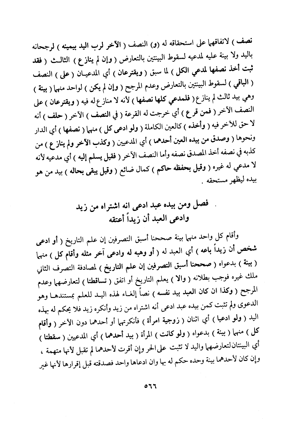 وَمَنْ بِيَدِهِ عَبْدٌ ادَّعَى أَنَّهُ اشْتَرَاهُ مِنْ زَيْدٍ وَادَّعَى الْعَبْدُ أَنَّ زَيْدًا أَعْتَقَهُ وَأَقَامَ كُلُّ وَاحِدٍ مِنْهُمَا بَيِّنَةً صَحَّحْنَا أَسْبَقَ التَّصَرُّفَيْنِ، إنْ عُلِمَ التَّارِيخُ، (أَوْ ادَّعَى شَخْصٌ أَنَّ زَيْدًا بَاعَهُ) أَيْ الْعَبْدَ لَهُ (أَوْ وَهَبَهُ لَهُ وَادَّعَى آخَرُ مِثْلَهُ وَأَقَامَ كُلٌّ) مِنْهُمَا (بَيِّنَةً) بِدَعْوَاهُ، (صَحَّحْنَا أَسْبَقَ التَّصَرُّفَيْنِ إنْ عُلِمَ التَّارِيخُ) لِمُصَادَفَةِ التَّصَرُّفِ الثَّانِي مِلْكَ غَيْرِهِ فَوَجَبَ بُطْلَانُهُ، (وَإِلَّا) يُعْلَمَ التَّارِيخُ أَوْ اتَّفَقَ (تَسَاقَطَتَا) لِتَعَارُضِهِمَا وَعَدَمِ الْمُرَجِّحِ.