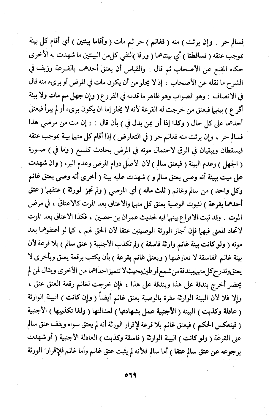 فَسَالِمٌ حُرٌّ. وَإِنْ بَرِئْتُ) مِنْهُ (فَغَانِمٌ) حُرٌّ ثُمَّ مَاتَ (وَأَقَامَا بَيِّنَتَيْنِ) أَيْ أَقَامَ كُلٌّ بَيِّنَةً بِمُوجَبِ عِتْقِهِ (تَسَاقَطَتَا) أَيْ بَيِّنَتَاهُمَا (وَرَقَّا) لِنَفْيِ كُلٍّ مِنْ الْبَيِّنَتَيْنِ مَا شَهِدَتْ بِهِ الْأُخْرَى حَكَاهُ الْمُقْنِعُ عَنْ الْأَصْحَابِ ثُمَّ قَالَ: وَالْقِيَاسُ أَنْ يُعْتَقَ أَحَدُهُمَا بِالْقُرْعَةِ، وَزَيَّفَ فِي الشَّرْحِ مَا نَقَلَهُ عَنْ الْأَصْحَابِ، إذْ لَا يَخْلُوَ مِنْ أَنْ يَكُونَ مَاتَ فِي الْمَرَضِ أَوْ بَرِئَ مِنْهُ. قَالَ فِي الْإِنْصَافِ: وَهُوَ الصَّوَابُ وَهُوَ ظَاهِرُ مَا قَدَّمَهُ فِي الْفُرُوعِ، (وَإِنْ جُهِلَ مِمَّا مَاتَ وَلَا بَيِّنَةَ أُقْرِعَ) بَيْنَهُمَا، فَيَعْتِقُ مَنْ خَرَجَتْ لَهُ الْقُرْعَةُ ; لِأَنَّهُ لَا يَخْلُوَ إمَّا أَنْ يَكُونَ بَرِئَ أَوْ لَمْ يَبْرَأْ، فَيَعْتِقُ أَحَدُهُمَا عَلَى كُلِّ حَالٍ.