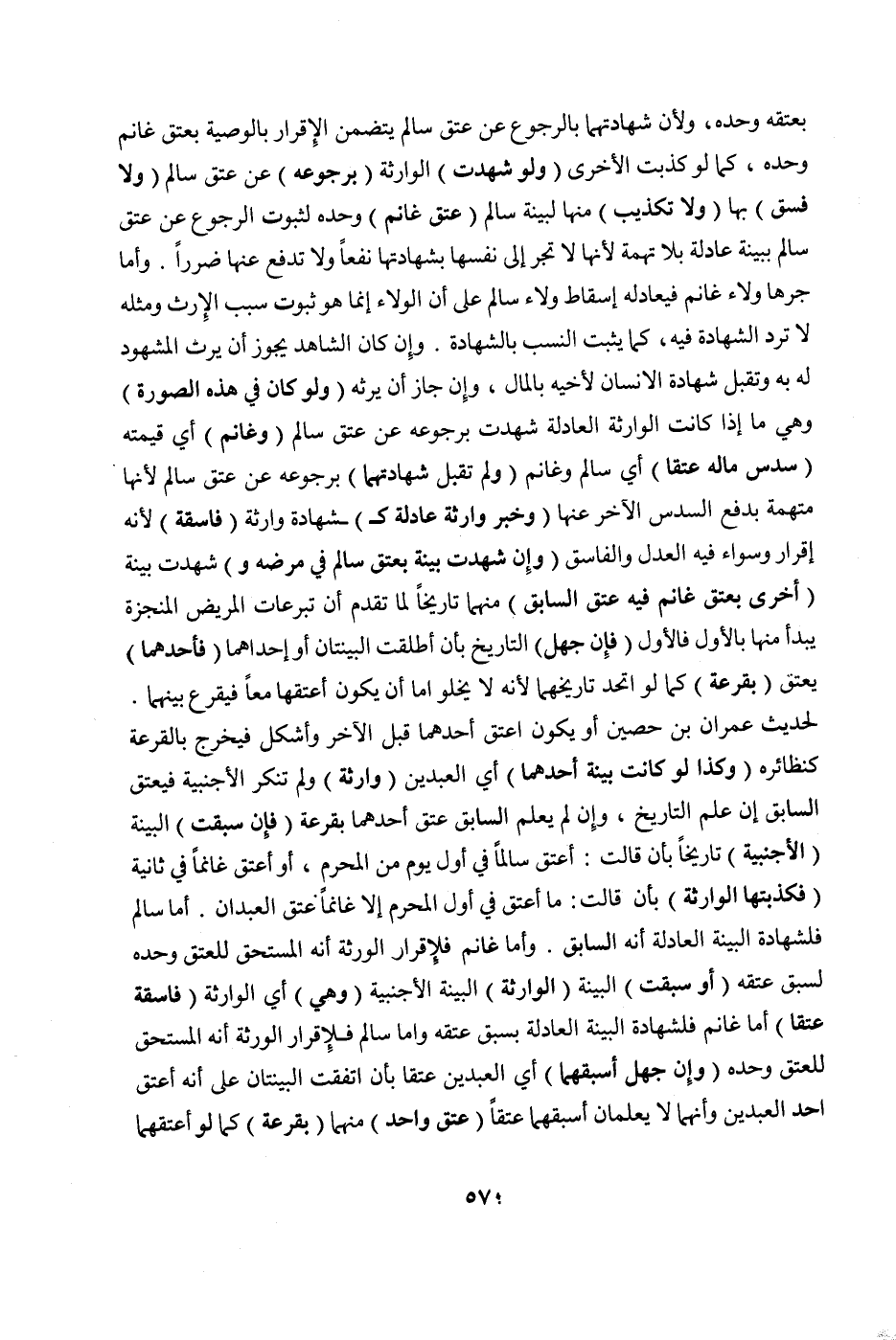 بِعِتْقِهِ وَحْدَهُ، وَلِأَنَّ شَهَادَتَهُمَا بِالرُّجُوعِ عَنْ عِتْقِ سَالِمٍ يَتَضَمَّنُ الْإِقْرَارَ بِالْوَصِيَّةِ بِعِتْقِ غَانِمٍ وَحْدَهُ، كَمَا لَوْ كَذَبَتْ الْأُخْرَى، (وَلَوْ شَهِدَتْ) الْوَارِثَةُ (بِرُجُوعِهِ) عَنْ عِتْقِ سَالِمٍ (وَلَا فِسْقَ) بِهَا (وَلَا تَكْذِيبَ) مِنْهَا لِبَيِّنَةِ سَالِمٍ (عَتَقَ غَانِمٌ) وَحْدَهُ لِثُبُوتِ الرُّجُوعِ عَنْ عِتْقِ سَالِمٍ بِبَيِّنَةٍ عَادِلَةٍ بِلَا تُهْمَةٍ ; لِأَنَّهَا لَا تَجُرُّ إلَى نَفْسِهَا بِشَهَادَتِهَا نَفْعًا وَلَا تَدْفَعُ عَنْهَا ضَرَرًا. وَأَمَّا جَرُّهَا وَلَاءَ غَانِمٍ فَيُعَادِلُهُ إسْقَاطُ وَلَاءِ سَالِمٍ عَلَى أَنَّ الْوَلَاءَ إنَّمَا هُوَ ثُبُوتُ سَبَبِ الْإِرْثِ وَمِثْلُهُ لَا تُرَدُّ الشَّهَادَةُ فِيهِ، كَمَا يَثْبُتُ النَّسَبُ بِالشَّهَادَةِ. وَإِنْ كَانَ الشَّاهِدُ يَجُوزُ أَنْ يَرِثَ الْمَشْهُودَ لَهُ بِهِ وَتُقْبَلُ شَهَادَةُ الْإِنْسَانِ لِأَخِيهِ بِالْمَالِ، وَإِنْ جَازَ أَنْ يَرِثَهُ (وَلَوْ كَانَ فِي هَذِهِ الصُّورَةِ) وَهِيَ مَا إذَا كَانَتْ الْوَارِثَةُ الْعَادِلَةُ شَهِدَتْ بِرُجُوعِهِ عَنْ عِتْقِ سَالِمٍ (وَغَانِمٍ) أَيْ قِيمَتِهِ (سُدُسُ مَالِهِ عَتَقَا) أَيْ سَالِمٌ وَغَانِمٌ، (وَلَمْ تُقْبَلْ شَهَادَتُهُمَا) بِرُجُوعِهِ عَنْ عِتْقِ سَالِمٍ ; لِأَنَّهَا مُتَّهَمَةٌ بِدَفْعِ السُّدُسِ الْآخَرِ عَنْهَا، (وَخَبَرُ وَارِثَةٍ عَادِلَةٍ كَ) شَهَادَةِ وَارِثَةٍ (فَاسِقَةٍ) ; لِأَنَّهُ إقْرَارٌ، وَسَوَاءٌ فِيهِ الْعَدْلُ وَالْفَاسِقُ (وَإِنْ شَهِدَتْ بَيِّنَةٌ بِعِتْقِ سَالِمٍ فِي مَرَضِهِ وَ) شَهِدَتْ بَيِّنَةٌ (أُخْرَى بِعِتْقِ غَانِمٍ فِيهِ عَتَقَ السَّابِقُ) مِنْهُمَا تَارِيخًا لِمَا تَقَدَّمَ أَنَّ تَبَرُّعَاتِ الْمَرِيضِ الْمُنَجَّزَةَ يَبْدَأُ مِنْهَا بِالْأَوَّلِ فَالْأَوَّلِ، (فَإِنَّ جُهِلَ) التَّارِيخُ بِأَنْ أُطْلِقَتْ الْبَيِّنَتَانِ أَوْ إحْدَاهُمَا (فَأَحَدُهُمَا) يَعْتِقُ (بِقُرْعَةٍ) كَمَا لَوْ اتَّحَدَ تَارِيخُهُمَا ; لِأَنَّهُ لَا يَخْلُوَ إمَّا أَنْ يَكُونَ أَعْتَقَهُمَا مَعًا فَيُقْرِعُ بَيْنَهُمَا. لِحَدِيثِ عِمْرَانَ بْنِ حُصَيْنٍ، أَوْ يَكُونَ أَعْتَقَ أَحَدَهُمَا قَبْلَ الْآخَرِ وَأَشْكَلَ فَيَخْرُجُ بِالْقُرْعَةِ كَنَظَائِرِهِ. (وَكَذَا لَوْ كَانَتْ بَيِّنَةُ أَحَدِهِمَا) أَيْ الْعَبْدَيْنِ (وَارِثَةً) وَلَمْ تُنْكِرْ الْأَجْنَبِيَّةُ فَيُعْتَقُ السَّابِقُ إنْ عَلِمَ التَّارِيخَ، وَإِنْ لَمْ يَعْلَمْ السَّابِقُ عَتَقَ أَحَدُهُمَا بِقُرْعَةٍ، (فَإِنْ سَبَقَتْ) الْبَيِّنَةُ (الْأَجْنَبِيَّةُ) تَارِيخًا بِأَنْ قَالَتْ: أَعْتَقَ سَالِمًا فِي أَوَّلِ يَوْمٍ مِنْ الْمُحَرَّمِ، أَوْ أَعْتَقَ غَانِمًا فِي ثَانِيهِ (فَكَذَّبَتْهَا الْوَارِثَةُ) بِأَنْ قَالَتْ: مَا أَعْتَقَ فِي أَوَّلِ الْمُحَرَّمِ إلَّا غَانِمًا عَتَقَ الْعَبْدَانِ. أَمَّا سَالِمٌ فَلِشَهَادَةِ الْبَيِّنَةِ الْعَادِلَةِ أَنَّهُ السَّابِقُ، وَأَمَّا غَانِمٌ فَلِإِقْرَارِ الْوَرَثَةِ أَنَّهُ الْمُسْتَحِقُّ لِلْعِتْقِ وَحْدَهُ لِسَبْقِ عِتْقِهِ، (أَوْ سَبَقَتْ) الْبَيِّنَةُ (الْوَارِثَةُ) الْبَيِّنَةَ الْأَجْنَبِيَّةَ، (وَهِيَ) أَيْ الْوَارِثَةُ (فَاسِقَةٌ عَتَقَا) ، أَمَّا غَانِمٌ فَلِشَهَادَةِ الْبَيِّنَةِ الْعَادِلَةِ بِسَبْقِ عِتْقِهِ، وَأَمَّا سَالِمٌ فَلِإِقْرَارِ الْوَرَثَةِ أَنَّهُ الْمُسْتَحِقُّ لِلْعِتْقِ وَحْدَهُ، (وَإِنْ جُهِلَ أَسْبَقُهُمَا) أَيْ الْعَبْدَيْنِ عَتَقَا بِأَنْ اتَّفَقَتْ الْبَيِّنَتَانِ عَلَى أَنَّهُ أَعْتَقَ أَحَدَ الْعَبْدَيْنِ وَأَنَّهُمَا لَا يَعْلَمَانِ أَسْبَقَهُمَا عِتْقًا (عَتَقَ وَاحِدٌ) مِنْهُمَا (بِقُرْعَةٍ) كَمَا لَوْ أَعْتَقَهُمَا