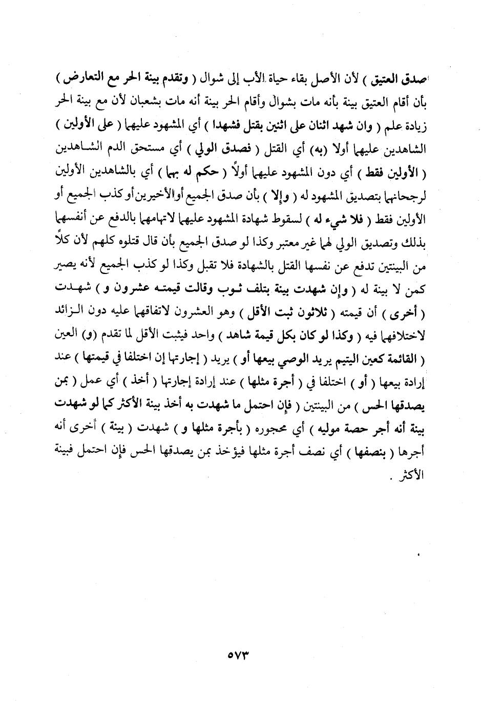 (وَإِنْ شَهِدَ اثْنَانِ عَلَى اثْنَيْنِ بِقَتْلٍ فَشَهِدَا) أَيْ الْمَشْهُودُ عَلَيْهِمَا (عَلَى الْأَوَّلَيْنِ) الشَّاهِدَيْنِ عَلَيْهِمَا أَوَّلًا (بِهِ) أَيْ الْقَتْلِ (فَصَدَّقَ الْوَلِيُّ) أَيْ: مُسْتَحِقُّ الدَّمِ الشَّاهِدَيْنِ (الْأَوَّلَيْنِ فَقَطْ) أَيْ: دُونَ الْمَشْهُودِ عَلَيْهِمَا أَوَّلًا (حُكِمَ لَهُ بِهِمَا) أَيْ بِالشَّاهِدَيْنِ الْأَوَّلَيْنِ لِرُجْحَانِهِمَا بِتَصْدِيقِ الْمَشْهُودِ لَهُ، (وَإِلَّا) بِأَنْ صَدَّقَ الْجَمِيعُ أَوْ الْأَخِيرَيْنِ أَوْ كَذَّبَ الْجَمِيعُ أَوْ الْأَوَّلَيْنِ فَقَطْ، (فَلَا شَيْءَ لَهُ) لِسُقُوطِ شَهَادَةِ الْمَشْهُودِ عَلَيْهِمَا ; لِاتِّهَامِهِمَا بِالدَّفْعِ عَنْ أَنْفُسِهِمَا بِذَلِكَ. وَتَصْدِيقُ الْوَلِيِّ لَهُمَا غَيْرُ مُعْتَبَرٍ، وَكَذَا لَوْ صَدَّقَ الْجَمِيعَ بِأَنْ قَالَ قَتَلُوهُ كُلُّهُمْ ; لِأَنَّ كُلًّا مِنْ الْبَيِّنَتَيْنِ تَدْفَعُ عَنْ نَفْسِهَا الْقَتْلَ بِالشَّهَادَةِ، فَلَا تُقْبَلُ وَكَذَا لَوْ كَذَّبَ الْجَمِيعَ ; لِأَنَّهُ يَصِيرُ كَمَنْ لَا بَيِّنَةَ لَهُ، (وَإِنْ شَهِدَتْ بَيِّنَةٌ بِتَلَفِ ثَوْبٍ وَقَالَتْ: قِيمَتُهُ عِشْرُونَ وَ) شَهِدَتْ (أُخْرَى) أَنَّ قِيمَتَهُ (ثَلَاثُونَ ثَبَتَ الْأَقَلُّ) وَهُوَ الْعِشْرُونَ لِاتِّفَاقِهِمَا عَلَيْهِ دُونَ الزَّائِدِ لِاخْتِلَافِهِمَا فِيهِ.