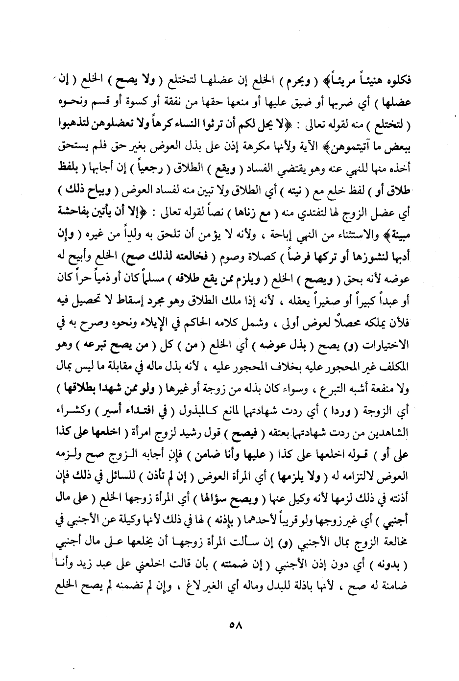 (وَيَحْرُمُ) الْخُلْعُ إنْ عَضَلَهَا لِتَخْتَلِعَ (وَلَا يَصِحُّ) الْخُلْعُ (إنْ عَضَلَهَا) أَيْ: ضَرَبَهَا أَوْ ضَيَّقَ عَلَيْهَا أَوْ مَنَعَهَا حَقَّهَا مِنْ نَفَقَةٍ أَوْ كِسْوَةٍ أَوْ قَسْمٍ وَنَحْوِهِ (لِتَخْتَلِعَ) مِنْهُ لِقَوْلِهِ تَعَالَى: {لَا يَحِلُّ لَكُمْ أَنْ تَرِثُوا النِّسَاءَ كَرْهًا وَلَا تَعْضُلُوهُنَّ لِتَذْهَبُوا بِبَعْضِ مَا أَتَيْتُمُوهُنَّ} [النساء: ١٩] الْآيَةُ ; وَلِأَنَّهَا مُكْرَهَةٌ إذَنْ عَلَى بَذْلِ الْعِوَضِ بِغَيْرِ حَقٍّ فَلَمْ يَسْتَحِقَّ أَخْذَهُ مِنْهَا لِلنَّهْيِ عَنْهُ وَهُوَ يَقْتَضِي الْفَسَادَ.