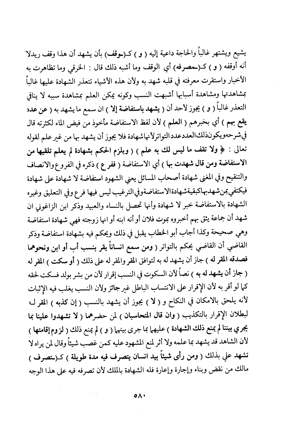 يَشِيعُ وَيَشْتَهِرُ غَالِبًا، وَالْحَاجَةُ دَاعِيَةٌ إلَيْهِ، (وَ) كَ (وَقْفٍ) بِأَنْ يَشْهَدَ أَنَّ هَذَا وَقْفُ زَيْدٍ لَا أَنَّهُ أَوْقَفَهُ، (وَ) كَ (مَصْرِفِهِ) أَيْ الْوَقْفِ وَمَا أَشْبَهَ ذَلِكَ قَالَ: الْخِرَقِيِّ: وَمَا تَظَاهَرَتْ بِهِ الْأَخْبَارُ وَاسْتَقَرَّتْ مَعْرِفَتُهُ فِي قَلْبِهِ شَهِدَ بِهِ ; وَلِأَنَّ هَذِهِ الْأَشْيَاءَ تَتَعَذَّرُ الشَّهَادَةُ عَلَيْهَا غَالِبًا بِمُشَاهَدَتِهَا وَمُشَاهَدَةِ أَسْبَابِهَا أَشْبَهَتْ النَّسَبَ، وَكَوْنُهُ يُمْكِنُ الْعِلْمُ بِمُشَاهَدَةِ سَبَبِهِ لَا يُنَافِي التَّعَذُّرَ غَالِبًا،.