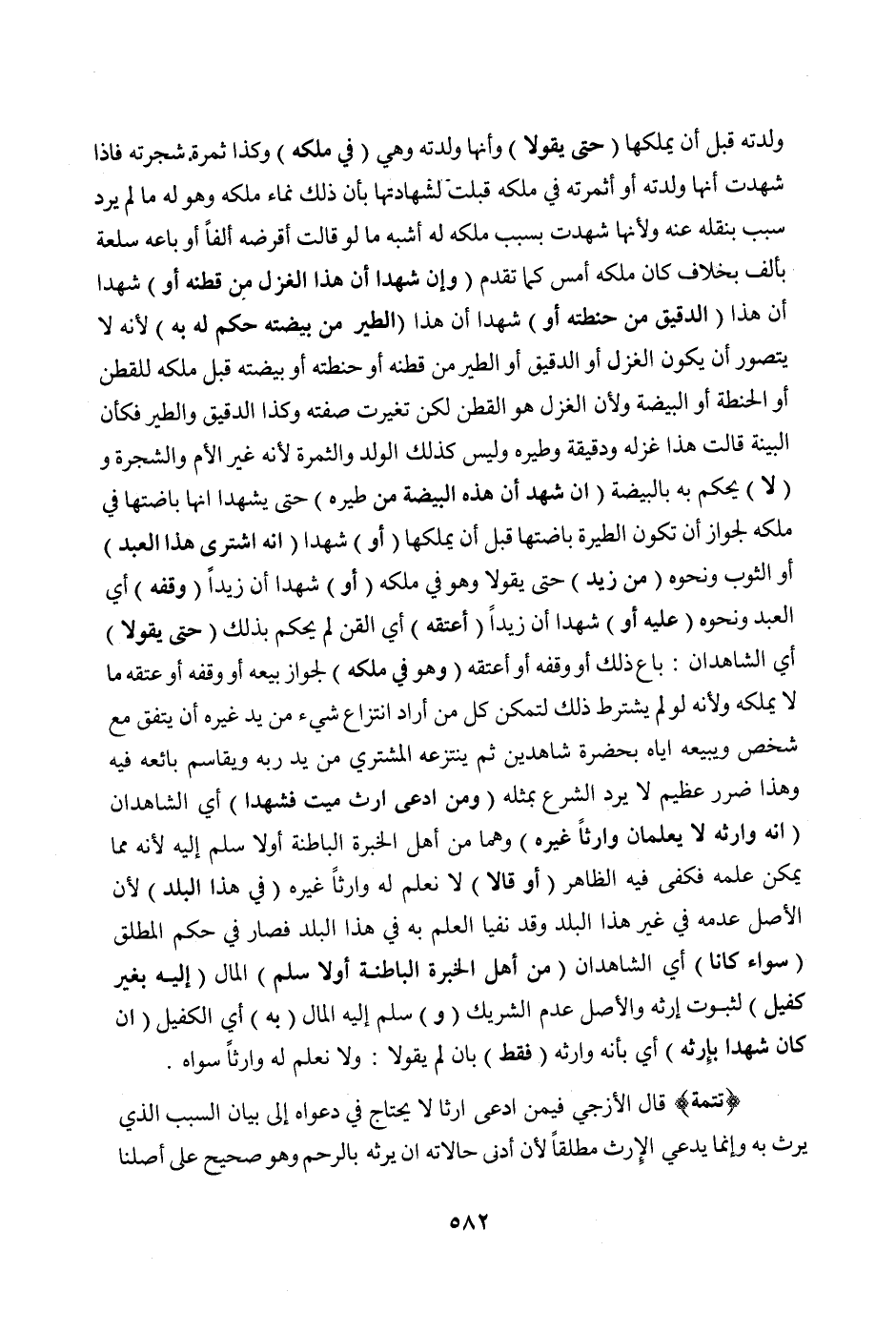 وَكَذَا الدَّقِيقُ وَالطَّيْرُ فَكَأَنَّ الْبَيِّنَةَ قَالَتْ: هَذَا غَزْلُهُ وَدَقِيقُهُ وَطَيْرُهُ، وَلَيْسَ كَذَلِكَ الْوَلَدُ وَالثَّمَرَةُ ; لِأَنَّهُ غَيْرُ الْأُمِّ وَالشَّجَرَةِ، وَ (لَا) يُحْكَمُ بِهِ بِالْبَيْضَةِ (إنْ شَهِدَ أَنَّ هَذِهِ الْبَيْضَةَ مِنْ طَيْرِهِ) حَتَّى يَشْهَدَا أَنَّهَا بَاضَتْهَا فِي مِلْكِهِ ; لِجَوَازِ أَنْ تَكُونَ الطَّيْرَةُ بَاضَتْهَا قَبْلَ أَنْ يَمْلِكَهَا، (أَوْ) شَهِدَا (أَنَّهُ اشْتَرَى هَذَا الْعَبْدَ) أَوْ الثَّوْبَ وَنَحْوَهُ (مِنْ زَيْدٍ) حَتَّى يَقُولَا: وَهُوَ فِي مِلْكِهِ، (أَوْ) شَهِدَا أَنَّ زَيْدًا (وَقَفَهُ) أَيْ الْعَبْدَ وَنَحْوَهُ (عَلَيْهِ، أَوْ) شَهِدَا أَنَّ زَيْدًا (أَعْتَقَهُ) أَيْ الْقِنَّ لَمْ يُحْكَمْ بِذَلِكَ (حَتَّى يَقُولَا) أَيْ الشَّاهِدَانِ: بَاعَ ذَلِكَ أَوْ وَقَفَهُ أَوْ أَعْتَقَهُ (وَهُوَ فِي مِلْكِهِ) ; لِجَوَازِ بَيْعِهِ أَوْ وَقْفِهِ أَوْ عِتْقِهِ مَا لَا يَمْلِكُهُ ; وَلِأَنَّهُ لَوْ لَمْ يَشْتَرِطْ ذَلِكَ لَتَمَكَّنَ كُلُّ مَنْ أَرَادَ انْتِزَاعَ شَيْءٍ مِنْ يَدِ غَيْرِهِ أَنْ يَتَّفِقَ مَعَ شَخْصٍ وَيَبِيعَهُ إيَّاهُ بِحَضْرَةِ شَاهِدَيْنِ ثُمَّ يَنْتَزِعُهُ الْمُشْتَرِي مِنْ يَدِ رَبِّهِ وَيُقَاسِمَ بَائِعَهُ فِيهِ، وَهَذَا ضَرَرٌ عَظِيمٌ لَا يَرِدُ الشَّرْعُ بِمِثْلِهِ