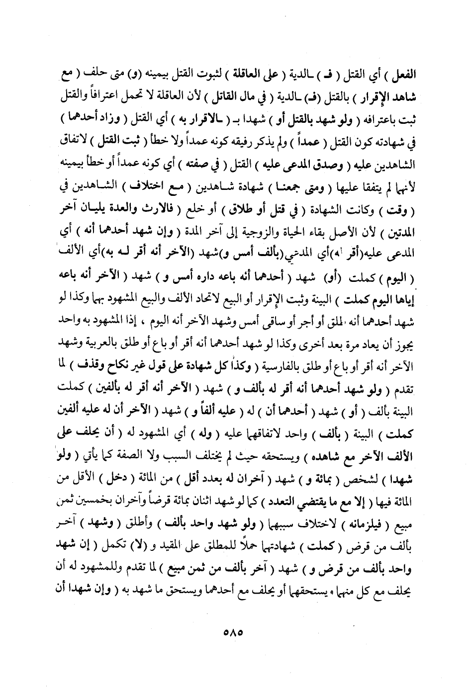 (وَ) مَتَى حَلَفَ (مَعَ شَاهِدِ الْإِقْرَارِ) بِالْقَتْلِ (فَ) الدِّيَةُ (فِي مَالِ الْقَاتِلِ) ; لِأَنَّ الْعَاقِلَةَ لَا تَحْمِلُ اعْتِرَافًا، وَالْقَتْلُ ثَبَتَ بِاعْتِرَافِهِ، (وَلَوْ شَهِدَ بِالْقَتْلِ أَوْ) شَهِدَا بِ (الْإِقْرَارِ بِهِ) أَيْ الْقَتْلِ، (وَزَادَ أَحَدُهُمَا) فِي شَهَادَتِهِ كَوْنَ الْقَتْلِ (عَمْدًا) ، وَلَمْ يَذْكُرْ رَفِيقُهُ كَوْنَهُ عَمْدًا وَلَا خَطَأً (ثَبَتَ الْقَتْلُ) لِاتِّفَاقِ الشَّاهِدَيْنِ عَلَيْهِ (وَصَدَّقَ الْمُدَّعَى عَلَيْهِ) الْقَتْلَ (فِي صِفَتِهِ) أَيْ كَوْنِهِ عَمْدًا أَوْ خَطَأً بِيَمِينِهِ ; لِأَنَّهُمَا لَمْ يَتَّفِقَا عَلَيْهَا، (وَمَتَى جَمَعْنَا) شَهَادَةَ شَاهِدَيْنِ (مَعَ اخْتِلَافِ) الشَّاهِدَيْنِ فِي (وَقْتٍ) ، وَكَانَتْ الشَّهَادَةُ (فِي قَتْلٍ أَوْ طَلَاقٍ) أَوْ خُلْعٍ (فَالْإِرْثُ وَالْعِدَّةُ يَلِيَانِ آخِرَ الْمُدَّتَيْنِ) ; لِأَنَّ الْأَصْلَ بَقَاءُ الْحَيَاةِ وَالزَّوْجِيَّةِ إلَى آخِرِ الْمُدَّةِ