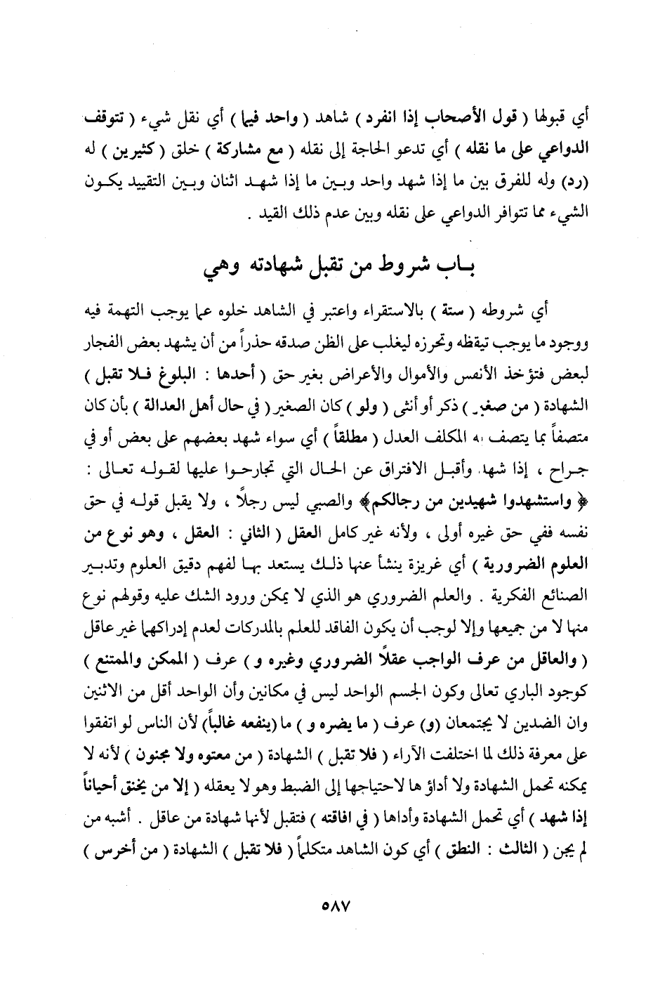 (الثَّانِي: الْعَقْلُ، وَهُوَ نَوْعٌ مِنْ الْعُلُومِ الضَّرُورِيَّةِ) أَيْ: غَرِيزَةٌ يَنْشَأُ عَنْهَا ذَلِكَ يُسْتَعَدُّ بِهَا لِفَهْمِ دَقِيقِ الْعُلُومِ وَتَدْبِيرِ الصَّنَائِعِ الْفِكْرِيَّةِ. وَالْعِلْمُ الضَّرُورِيُّ هُوَ الَّذِي لَا يُمْكِنُ وُرُودُ الشَّكِّ عَلَيْهِ، وَقَوْلُهُمْ نَوْعٌ مِنْهَا لَا مِنْ جَمِيعِهَا وَإِلَّا لَوَجَبَ أَنْ يَكُونَ الْفَاقِدُ لِلْعِلْمِ بِالْمُدْرَكَاتِ ; لِعَدَمِ إدْرَاكِهِمَا غَيْرَ عَاقِلٍ، (وَالْعَاقِلُ مَنْ عَرَفَ الْوَاجِبَ عَقْلًا الضَّرُورِيَّ وَغَيْرَهُ، وَ) عَرَفَ (الْمُمْكِنَ وَالْمُمْتَنِعَ) كَوُجُودِ الْبَارِي تَعَالَى وَكَوْنِ الْجِسْمِ الْوَاحِدِ لَيْسَ فِي مَكَانَيْنِ وَأَنَّ الْوَاحِدَ أَقَلُّ مِنْ الِاثْنَيْنِ وَأَنَّ الضِّدَّيْنِ لَا يَجْتَمِعَانِ، (وَ) عَرَفَ (مَا يَضُرُّهُ وَ) مَا (يَنْفَعُهُ غَالِبًا) ; لِأَنَّ النَّاسَ لَوْ اتَّفَقُوا عَلَى مَعْرِفَةِ ذَلِكَ لَمَا اخْتَلَفَتْ الْآرَاءُ، (فَلَا تُقْبَلُ) الشَّهَادَةُ (مِنْ مَعْتُوهٍ وَلَا مَجْنُونٍ) ; لِأَنَّهُ لَا يُمْكِنُهُ تَحَمُّلُ الشَّهَادَةِ وَلَا أَدَاؤُهَا لِاحْتِيَاجِهَا إلَى الضَّبْطِ، وَهُوَ لَا يَعْقِلُهُ (إلَّا مَنْ يُخْنَقُ أَحْيَانًا إذَا شَهِدَ) أَيْ تَحَمَّلَ الشَّهَادَةَ وَأَدَّاهَا (فِي إفَاقَتِهِ) فَتُقْبَلُ ; لِأَنَّهَا شَهَادَةٌ مِنْ عَاقِلٍ. أَشْبَهَ مَنْ لَمْ يُجَنَّ