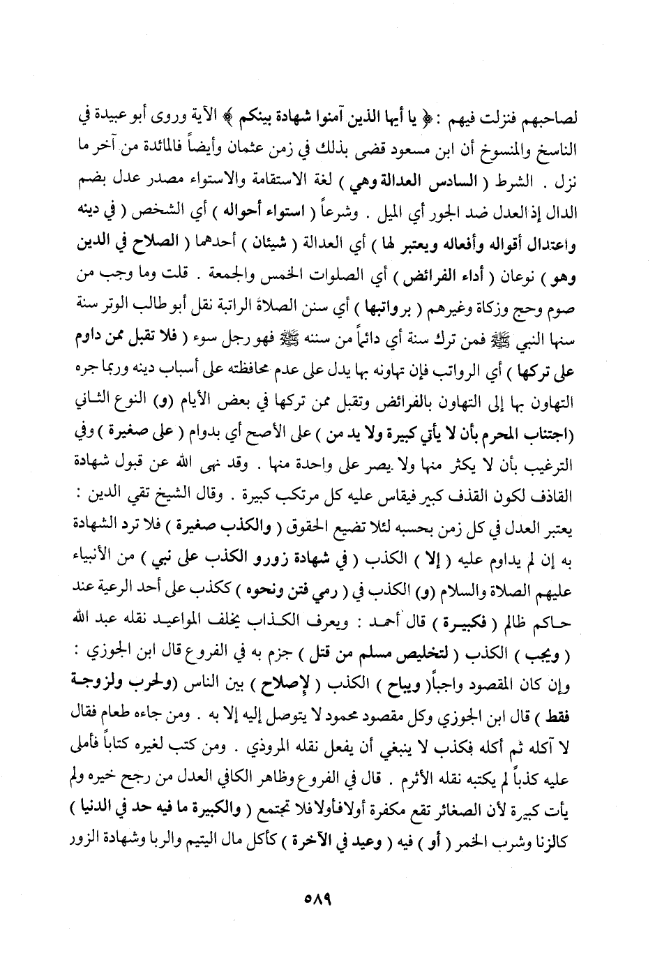 وَفِي التَّرْغِيبِ بِأَنْ لَا يُكْثِرَ مِنْهَا وَلَا يُصِرَّ عَلَى وَاحِدَةٍ مِنْهَا. وَقَدْ نَهَى اللَّهُ عَنْ قَبُولِ شَهَادَةِ الْقَاذِفِ لِكَوْنِ الْقَذْفِ كَبِيرًا فَيُقَاسُ عَلَيْهِ كُلُّ مُرْتَكِبِ كَبِيرَةٍ. وَقَالَ الشَّيْخُ تَقِيُّ الدِّينِ: يُعْتَبَرُ الْعَدْلُ فِي كُلِّ زَمَنٍ بِحَسْبِهِ لِئَلَّا تَضِيعَ الْحُقُوقُ، (وَالْكَذِبُ صَغِيرَةٌ) فَلَا تُرَدُّ الشَّهَادَةُ بِهِ إنْ لَمْ يُدَاوِمْ عَلَيْهِ، (إلَّا) الْكَذِبُ (فِي شَهَادَةِ زُورٍ وَالْكَذِبُ عَلَى نَبِيٍّ) مِنْ الْأَنْبِيَاءِ عَلَيْهِمْ الصَّلَاةُ وَالسَّلَامُ، (وَ) الْكَذِبُ فِي (زَمَنِ فِتَنٍ وَنَحْوِهِ) كَكَذِبٍ عَلَى أَحَدِ الرَّعِيَّةِ عِنْدَ حَاكِمٍ ظَالِمٍ (فَكَبِيرَةٌ) قَالَ أَحْمَدُ: وَيُعْرَفُ الْكَذَّابُ بِخُلْفِ الْمَوَاعِيدِ نَقَلَهُ عَبْدُ اللَّهِ، (وَيَجِبُ) الْكَذِبُ (لِتَخْلِيصِ مُسْلِمٍ مِنْ قَتْلٍ) .