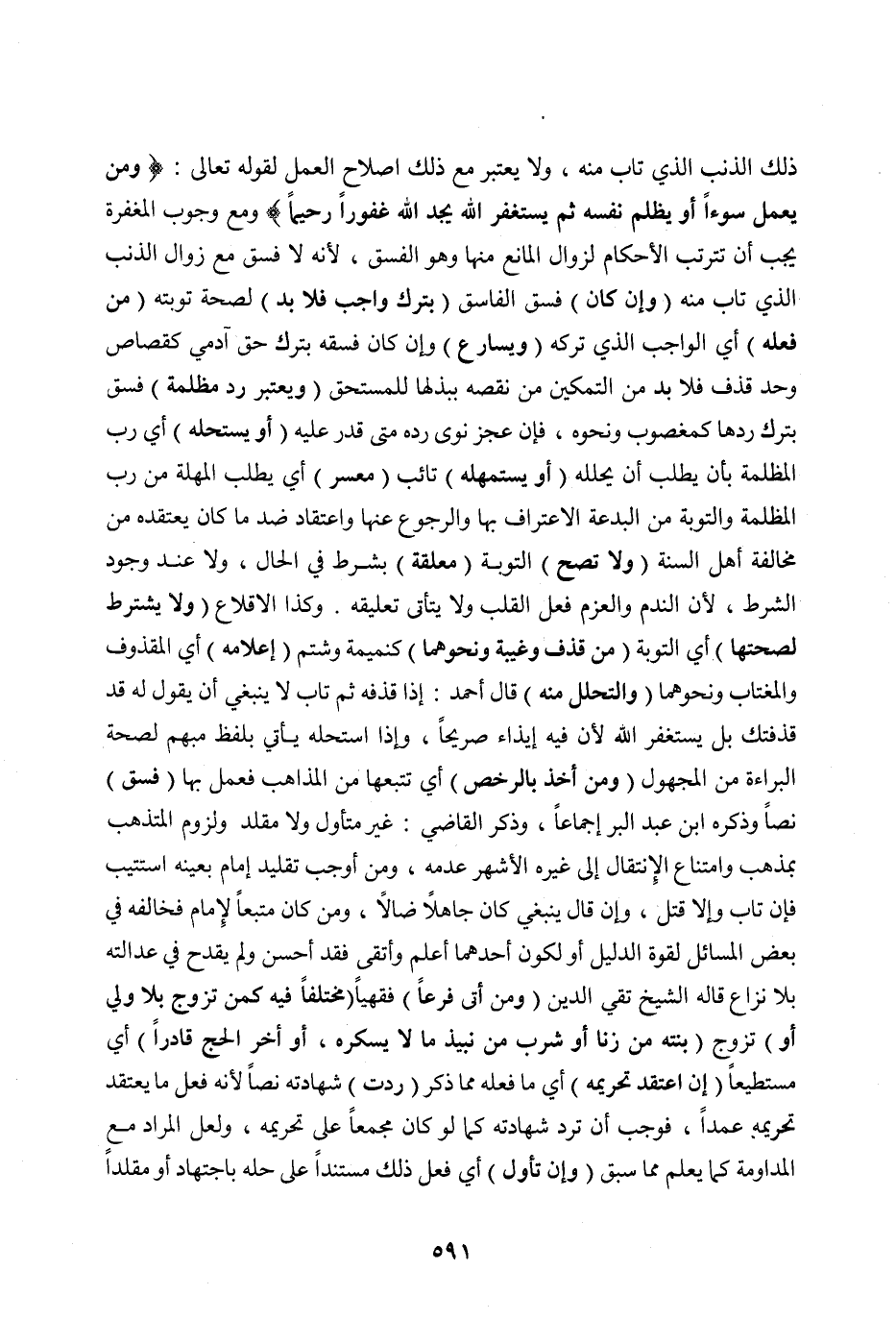ذَلِكَ الذَّنْبِ الَّذِي تَابَ مِنْهُ، وَلَا يُعْتَبَرُ مَعَ ذَلِكَ إصْلَاحُ الْعَمَلِ لِقَوْلِهِ تَعَالَى: {وَمَنْ يَعْمَلْ سُوءًا أَوْ يَظْلِمْ نَفْسَهُ ثُمَّ يَسْتَغْفِرْ اللَّهَ يَجِدْ اللَّهَ غَفُورًا رَحِيمًا،} [النساء: ١١٠] وَمَعَ وُجُوبِ الْمَغْفِرَةِ يَجِبُ أَنْ تَتَرَتَّبَ الْأَحْكَامُ لِزَوَالِ الْمَانِعِ مِنْهَا وَهُوَ الْفِسْقُ ; لِأَنَّهُ لَا فِسْقَ مَعَ زَوَالِ الذَّنْبِ الَّذِي تَابَ مِنْهُ، (وَإِنْ كَانَ) فِسْقُ الْفَاسِقِ (بِتَرْكِ وَاجِبٍ فَلَا بُدَّ) لِصِحَّةِ تَوْبَتِهِ (مِنْ فِعْلِهِ) أَيْ: الْوَاجِبِ الَّذِي تَرَكَهُ (وَيُسَارِعُ) وَإِنْ كَانَ فِسْقُهُ بِتَرْكِ حَقِّ آدَمِيٍّ كَقِصَاصٍ وَحَدِّ قَذْفٍ، فَلَا بُدَّ مِنْ التَّمْكِينِ مِنْ نَقْصِهِ بِبَذْلِهَا لِلْمُسْتَحِقِّ. (وَيُعْتَبَرُ رَدَّ مَظْلِمَةً) فَسَقَ بِتَرْكِ رَدِّهَا كَمَغْصُوبٍ وَنَحْوِهِ، فَإِنَّ عَجَزَ نَوَى رَدَّهُ مَتَى قَدَرَ عَلَيْهِ (أَوْ يَسْتَحِلُّهُ) أَيْ رَبُّ الْمَظْلِمَةِ بِأَنْ يَطْلُبَ أَنْ يُحْلِلَهُ (أَوْ يَسْتَمْهِلَهُ) تَائِبٌ (مُعْسِرٌ) أَيْ يَطْلُبَ الْمُهْلَةَ مِنْ رَبِّ الْمَظْلِمَةِ، وَالتَّوْبَةُ مِنْ الْبِدْعَةِ الِاعْتِرَافُ بِهَا وَالرُّجُوعُ عَنْهَا وَاعْتِقَادُ ضِدِّ مَا كَانَ يَعْتَقِدُهُ مِنْ مُخَالَفَةِ أَهْلِ السُّنَّةِ (وَلَا تَصِحُّ) التَّوْبَةُ (مُعَلَّقَةً) بِشَرْطٍ فِي الْحَالِ، وَلَا عِنْدَ وُجُودِ الشَّرْطِ ; لِأَنَّ النَّدَمَ وَالْعَزْمَ فِعْلُ الْقَلْبِ وَلَا يَتَأَتَّى تَعْلِيقُهُ.