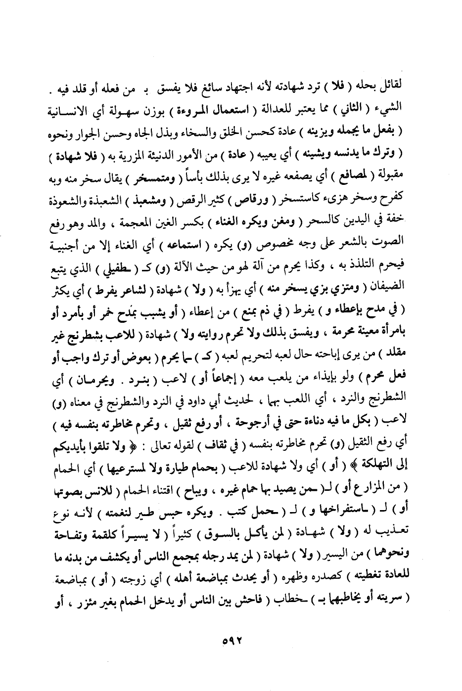 الشَّيْءُ (الثَّانِي) مِمَّا يُعْتَبَرُ لِلْعَدَالَةِ (اسْتِعْمَالُ الْمُرُوءَةِ) بِوَزْنِ سُهُولَةٍ أَيْ الْإِنْسَانِيَّةِ (بِفِعْلِ مَا يُجَمِّلُهُ وَيُزَيِّنُهُ) عَادَةً كَحُسْنِ الْخُلُقِ وَالسَّخَاءِ وَبَذْلِ الْجَاهِ وَحُسْنِ الْجِوَارِ وَنَحْوِهِ، (وَتَرْكِ مَا يُدَنِّسُهُ وَيَشِينُهُ) أَيْ: يَعِيبُهُ (عَادَةً) مِنْ الْأُمُورِ الدَّنِيئَةِ الْمُزْرِيَةِ بِهِ، (فَلَا شَهَادَةَ) مَقْبُولَةٌ (لِمُصَافَعٍ) أَيْ يَصْفَعُهُ غَيْرُهُ لَا يَرَى بِذَلِكَ بَأْسًا (وَمُتَمَسْخَرٍ) يُقَالُ: سَخِرَ مِنْهُ وَبِهِ كَفَرِحَ وَسَخِرَ هَزِئَ كَاسْتَسْخَرَ (وَرَقَّاصٍ) كَثِيرِ الرَّقْصِ (وَمُشَعْبِذٍ) الشَّعْبَذَةُ وَالشَّعْوَذَةُ خِفَّةٌ فِي الْيَدَيْنِ كَالسِّحْرِ (وَمُغَنٍّ وَيُكْرَهُ الْغِنَاءُ) بِكَسْرِ الْغَيْنِ الْمُعْجَمَةِ وَالْمَدِّ، وَهُوَ رَفْعُ الصَّوْتِ بِالشِّعْرِ عَلَى وَجْهٍ مَخْصُوصٍ،.