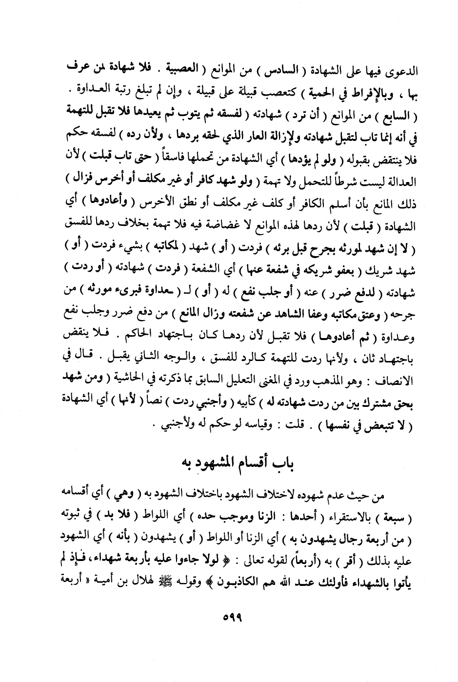 ِ مِنْ حَيْثُ عَدَدِ شُهُودِهِ لِاخْتِلَافِ الشُّهُودِ بِاخْتِلَافِ الشُّهُودِ بِهِ (وَهِيَ) أَيْ أَقْسَامُهُ (سَبْعَةٌ) بِالِاسْتِقْرَاءِ (أَحَدُهَا: الزِّنَا وَمُوجِبُ حَدِّهِ) أَيْ اللِّوَاطُ (فَلَا بُدَّ) فِي ثُبُوتِهِ (مِنْ أَرْبَعَةِ رِجَالٍ يَشْهَدُونَ بِهِ) أَيْ الزِّنَا أَوْ اللِّوَاطِ (أَوْ) يَشْهَدُونَ (بِأَنَّهُ) أَيْ: الْمَشْهُودَ عَلَيْهِ بِذَلِكَ (أَقَرَّ) بِهِ (أَرْبَعًا) لِقَوْلِهِ تَعَالَى: {لَوْلَا جَاءُوا عَلَيْهِ بِأَرْبَعَةِ شُهَدَاءَ، فَإِذْ لَمْ يَأْتُوا بِالشُّهَدَاءِ فَأُولَئِكَ عِنْدَ اللَّهِ هُمْ الْكَاذِبُونَ} [النور: ١٣] وَقَوْلِهِ صَلَّى اللَّهُ عَلَيْهِ وَسَلَّمَ لِهِلَالِ بْنِ أُمَيَّةَ "