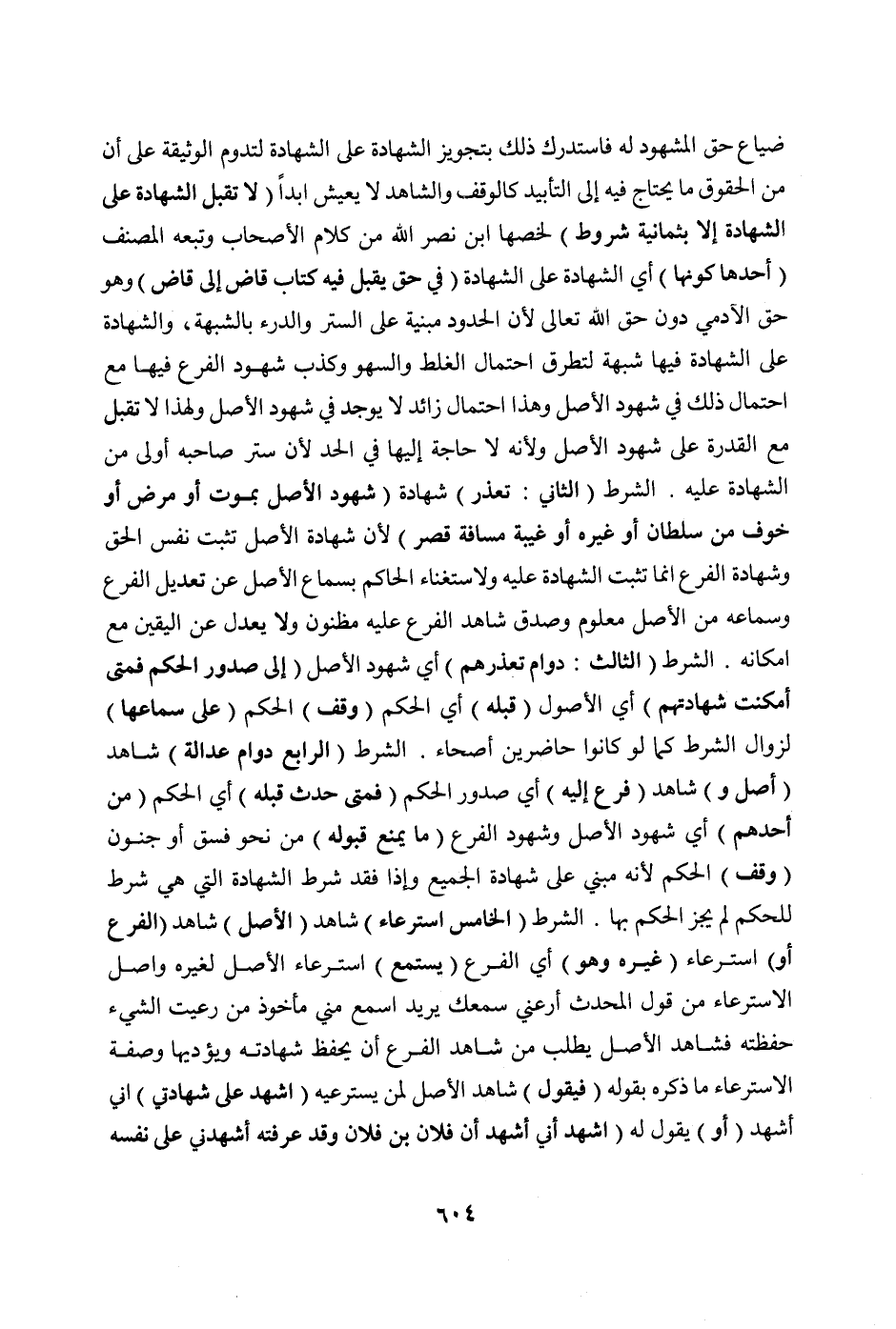 الشَّرْطُ (الرَّابِعُ: دَوَامُ عَدَالَةِ) شَاهِدِ (أَصْلٍ وَ) شَاهِدِ (فَرْعٍ إلَيْهِ) أَيْ صُدُورِ الْحَكَمِ (فَمَتَى حَدَثَ قَبْلَهُ) أَيْ الْحُكْمِ (مِنْ أَحَدِهِمْ) أَيْ شُهُودِ الْأَصْلِ وَشُهُودِ الْفَرْعِ (مَا يَمْنَعُ قَبُولَهُ) مِنْ نَحْوِ فِسْقٍ أَوْ جُنُونٍ (وُقِفَ) الْحُكْمُ لِأَنَّهُ مَبْنِيٌّ عَلَى شَهَادَةِ الْجَمِيعِ وَإِذَا فُقِدَ شَرْطُ الشَّهَادَةِ الَّتِي هِيَ شَرْطٌ لِلْحُكْمِ لَمْ يَجُزْ الْحُكْمُ بِهَا. الشَّرْطُ (الْخَامِسُ: اسْتِرْعَاءُ) شَاهِدِ (الْأَصْلِ) شَاهِدَ (الْفَرْعِ أَوْ) اسْتِرْعَاءُ (غَيْرِهِ وَهُوَ) أَيْ الْفَرْعُ (يَسْتَمِعُ) اسْتِرْعَاءَ الْأَصْلِ لِغَيْرِهِ وَأَصْلُ الِاسْتِرْعَاءِ مِنْ قَوْلِ الْمُحَدِّثِ: أَرِعْنِي سَمْعَك، يُرِيدُ: اسْمَعْ مِنِّي، مَأْخُوذٌ مِنْ رَعَيْتُ الشَّيْءَ: حَفِظْتَهُ، فَشَاهِدُ الْأَصْلِ يَطْلُبُ مِنْ شَاهِدِ الْفَرْعِ أَنْ يَحْفَظَ شَهَادَتَهُ وَيُؤَدِّيَهَا وَصِفَةُ الِاسْتِرْعَاءِ مَا ذَكَرَهُ بِقَوْلِهِ (فَيَقُولُ) شَاهِدُ الْأَصْلِ لِمَنْ يَسْتَرْعِيهِ (اشْهَدْ عَلَى شَهَادَتِي) أَنِّي أَشْهَدُ.