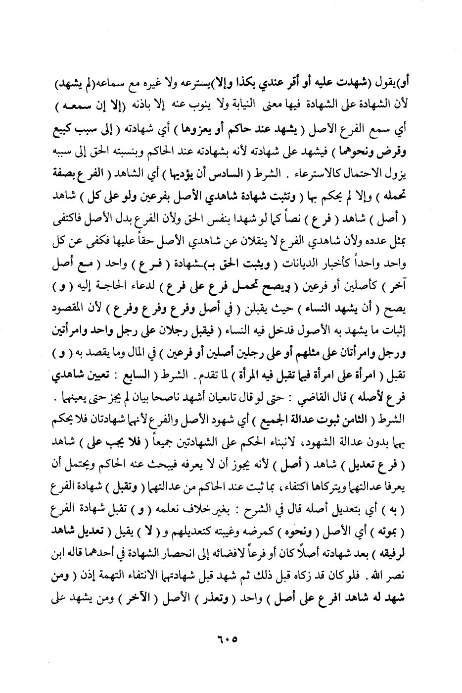 الشَّرْطُ (السَّادِسُ: أَنْ يُؤَدِّيَهَا) أَيْ الشَّاهِدُ (الْفَرْعُ بِصِفَةِ) تَحَمُّلِهِ وَإِلَّا لَمْ يُحْكَمْ بِهَا (وَتَثْبُتُ شَهَادَةُ شَاهِدَيْ الْأَصْلِ بِفَرْعَيْنِ وَلَوْ عَلَى كُلِّ) شَاهِدِ (أَصْلٍ) شَاهِدُ (فَرْعٍ) نَصًّا كَمَا لَوْ شَهِدَا بِنَفْسِ الْحَقِّ وَلِأَنَّ الْفَرْعَ بَدَلُ الْأَصْلِ فَاكْتُفِيَ بِمِثْلِ عَدَدِهِ وَلِأَنَّ شَاهِدَيْ الْفَرْعِ لَا يَنْقُلَانِ عَنْ شَاهِدَيْ الْأَصْلِ حَقًّا عَلَيْهَا فَكَفَى عَنْ كُلِّ وَاحِدٍ وَاحِدٌ كَأَخْبَارِ الدِّيَانَاتِ (وَيَثْبُتُ الْحَقُّ بِ) شَهَادَةِ (فَرْعٍ) وَاحِدٍ (مَعَ أَصْلٍ آخَرَ) كَأَصْلَيْنِ أَوْ فَرَعَيْنَ (وَيَصِحُّ تَحَمُّلُ فَرْعٍ عَلَى فَرْعٍ) لِدُعَاءِ الْحَاجَةِ إلَيْهِ (وَ) يَصِحُّ (أَنْ يَشْهَدَ النِّسَاءُ) حَيْثُ يُقْبَلْنَ (فِي أَصْلٍ وَفَرْعٍ وَفَرْعٍ وَفَرْعٍ) لِأَنَّ الْمَقْصُودَ إثْبَاتُ مَا يَشْهَدُ بِهِ الْأُصُولُ فَدَخَلَ فِيهِ النِّسَاءُ (فَيُقْبَلُ رَجُلَانِ عَلَى رَجُلٍ وَاحِدٍ وَامْرَأَتَيْنِ وَرَجُلٌ وَامْرَأَتَانِ عَلَى مِثْلِهِمْ أَوْ عَلَى رَجُلَيْنِ أَصْلَيْنِ أَوْ فَرَعَيْنَ) فِي الْمَالِ وَمَا يُقْصَدُ بِهِ (وَ) تُقْبَلُ (امْرَأَةٌ عَلَى امْرَأَةٍ فِيمَا تُقْبَلُ فِيهِ الْمَرْأَةُ) لِمَا تَقَدَّمَ.