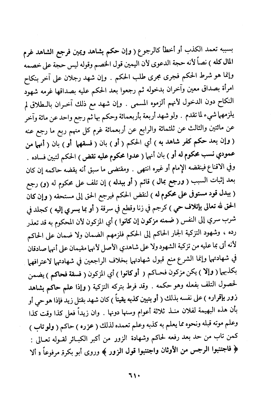 (وَإِذَا عَلِمَ حَاكِمٌ بِشَاهِدِ زُورٍ بِإِقْرَارِهِ) عَلَى نَفْسِهِ بِذَلِكَ (أَوْ بِتَبَيُّنِ كَذِبِهِ يَقِينًا) كَأَنْ شَهِدَ بِقَتْلِ زَيْدٍ فَإِذَا هُوَ حَيٌّ أَوْ بِأَنَّ هَذِهِ الْبَهِيمَةَ لِفُلَانٍ مُنْذُ ثَلَاثَةِ أَعْوَامٍ وَسِنُّهَا دُونَهَا. وَإِنَّ زَيْدًا فَعَلَ كَذَا وَقْتَ كَذَا وَعُلِمَ مَوْتُهُ قَبْلَهُ وَنَحْوُهُ مِمَّا يُعْلَمُ بِهِ كَذِبُهُ وَعُلِمَ تَعَمُّدُهُ لِذَلِكَ (عَزَّرَهُ) حَاكِمٌ (وَلَوْ تَابَ) كَمَنْ تَابَ مِنْ حَدٍّ بَعْدَ رَفْعِهِ لِحَاكِمٍ وَشَهَادَةُ الزُّورِ مِنْ أَكْبَرِ الْكَبَائِرِ لِقَوْلِهِ تَعَالَى: {فَاجْتَنِبُوا الرِّجْسَ مِنْ الْأَوْثَانِ وَاجْتَنِبُوا قَوْلَ الزُّورِ} [الحج: ٣٠] وَرَوَى أَبُو بَكْرَةَ مَرْفُوعًا