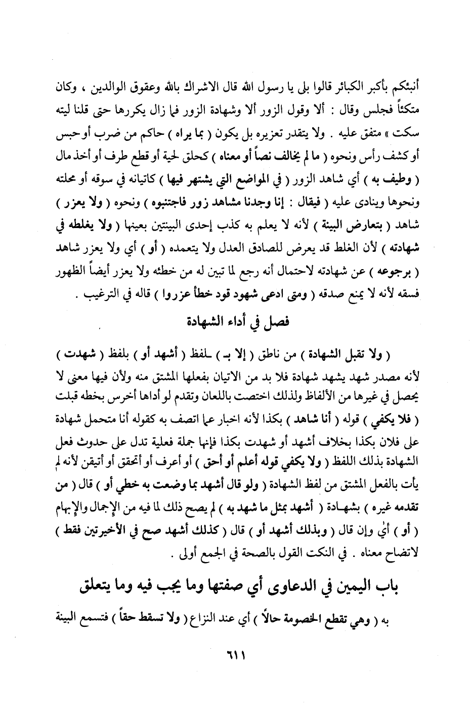 «أَلَا أُنَبِّئُكُمْ بِأَكْبَرِ الْكَبَائِرِ قَالُوا بَلَى يَا رَسُولَ اللَّهِ قَالَ: الْإِشْرَاكُ بِاَللَّهِ وَعُقُوقُ الْوَالِدَيْنِ، وَكَانَ مُتَّكِئًا فَجَلَسَ وَقَالَ: أَلَا وَقَوْلُ الزُّورِ أَلَا وَشَهَادَةُ الزُّورِ فَمَا زَالَ يُكَرِّرُهَا حَتَّى قُلْنَا لَيْتَهُ سَكَتَ» مُتَّفَقٌ عَلَيْهِ. وَلَا يَتَقَدَّرُ تَعْزِيرُهُ بَلْ يَكُونُ (بِمَا يَرَاهُ) حَاكِمٌ مِنْ ضَرْبٍ أَوْ حَبْسٍ أَوْ كَشْفِ رَأْسٍ وَنَحْوِهِ (مَا لَمْ يُخَالِفْ نَصًّا أَوْ مَعْنَاهُ) كَحَلْقِ لِحْيَةٍ أَوْ قَطْعِ طَرْفٍ أَوْ أَخْذِ مَالٍ (وَطِيفَ بِهِ) أَيْ شَاهِدِ الزُّورِ (فِي الْمَوَاضِعِ الَّتِي يَشْتَهِرُ فِيهَا) كَإِتْيَانِهِ فِي سُوقِهِ أَوْ مَحَلَّتِهِ وَنَحْوِهَا وَيُنَادِي عَلَيْهِ (فَيُقَالُ: إنَّا وَجَدْنَاهُ شَاهِدَ زُورٍ فَاجْتَنِبُوهُ) وَنَحْوَهُ (وَلَا يُعَزَّرُ) شَاهِدٌ (بِتَعَارُضِ الْبَيِّنَةِ) لِأَنَّهُ لَا يُعْلَمُ بِهِ كَذِبُ إحْدَى الْبَيِّنَتَيْنِ بِعَيْنِهَا (وَلَا يُغَلِّطُهُ فِي شَهَادَتِهِ) لِأَنَّ الْغَلَطَ قَدْ يَعْرِضُ لِلصَّادِقِ الْعَدْلِ وَلَا يَتَعَمَّدُهُ (أَوْ) أَيْ وَلَا يُعَزَّرُ شَاهِدٌ (بِرُجُوعِهِ) عَنْ شَهَادَتِهِ لِاحْتِمَالِ أَنَّهُ رَجَعَ لِمَا تَبَيَّنَ لَهُ مِنْ خَطَئِهِ وَلَا يُعَزَّرُ أَيْضًا لِظُهُورِ فِسْقِهِ لِأَنَّهُ لَا يَمْنَعُ صِدْقَهُ (وَمَتَى ادَّعَى شُهُودُ قَوَدٍ خَطَأً عُزِّرُوا) قَالَهُ فِي التَّرْغِيبِ.
