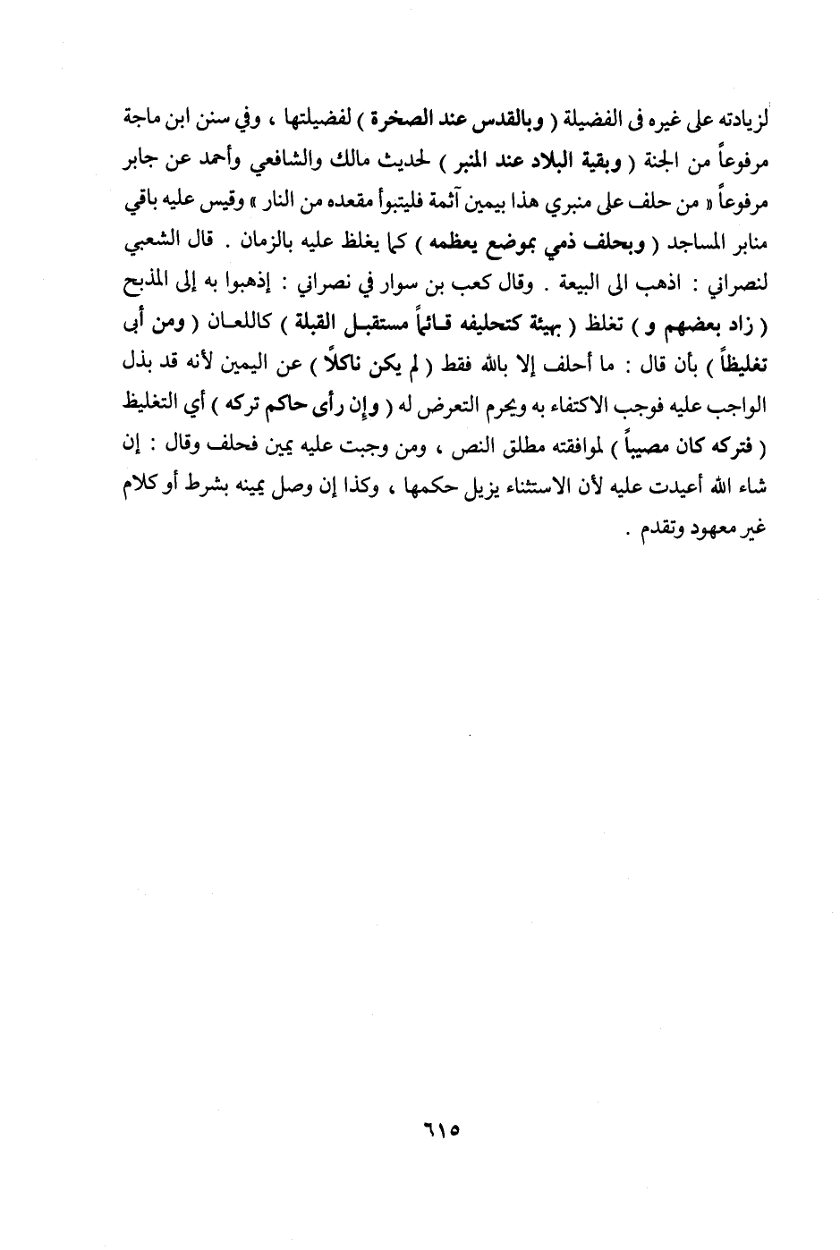 وَفِي سُنَنِ ابْنِ مَاجَهْ مَرْفُوعًا مِنْ الْجَنَّةِ (وَبَقِيَّةِ الْبِلَادِ عِنْدَ الْمِنْبَرِ) لِحَدِيثِ مَالِكٍ وَالشَّافِعِيِّ وَأَحْمَدَ عَنْ جَابِرٍ مَرْفُوعًا «مَنْ حَلَفَ عَلَى مِنْبَرِي هَذَا بِيَمِينٍ آثِمَةٍ فَلْيَتَبَوَّأْ مَقْعَدَهُ مِنْ النَّارِ» وَقِيسَ عَلَيْهِ بَاقِي مَنَابِرِ الْمَسَاجِدِ (وَبِحَلِفِ ذِمِّيٍّ بِمَوْضِعٍ يُعَظِّمُهُ) كَمَا يُغَلَّظُ عَلَيْهِ بِالزَّمَانِ. قَالَ الشَّعْبِيُّ لِنَصْرَانِيٍّ: اذْهَبْ إلَى الْبَيْعَةِ. وَقَالَ كَعْبُ بْنُ سَوَّارٍ فِي نَصْرَانِيٍّ: اذْهَبُوا بِهِ إلَى الْمَذْبَحِ (زَادَ بَعْضُهُمْ وَ) تُغَلَّظُ (بِهَيْئَةٍ كَتَحْلِيفِهِ قَائِمًا مُسْتَقْبِلَ الْقِبْلَةِ) كَاللِّعَانِ (وَمَنْ أَبَى تَغْلِيظًا) بِأَنْ قَالَ: مَا أَحْلِفُ إلَّا بِاَللَّهِ فَقَطْ (لَمْ يَكُنْ نَاكِلًا) عَنْ الْيَمِينِ لِأَنَّهُ قَدْ بَذَلَ الْوَاجِبَ عَلَيْهِ فَوَجَبَ الِاكْتِفَاءُ بِهِ وَيَحْرُمُ التَّعَرُّضُ لَهُ (وَإِنْ رَأَى حَاكِمٌ تَرْكَهُ) أَيْ التَّغْلِيظَ (فَتَرَكَهُ كَانَ مُصِيبًا) لِمُوَافَقَتِهِ مُطْلَقَ النَّصِّ، وَمَنْ وَجَبَتْ عَلَيْهِ يَمِينٌ فَحَلَفَ وَقَالَ: إنْ شَاءَ اللَّهُ أُعِيدَتْ عَلَيْهِ لِأَنَّ الِاسْتِثْنَاءَ يُزِيلُ حُكْمَهَا، وَكَذَا إنْ وَصَلَ يَمِينَهُ بِشَرْطٍ أَوْ كَلَامٍ غَيْرِ مَعْهُودٍ وَتَقَدَّمَ.
