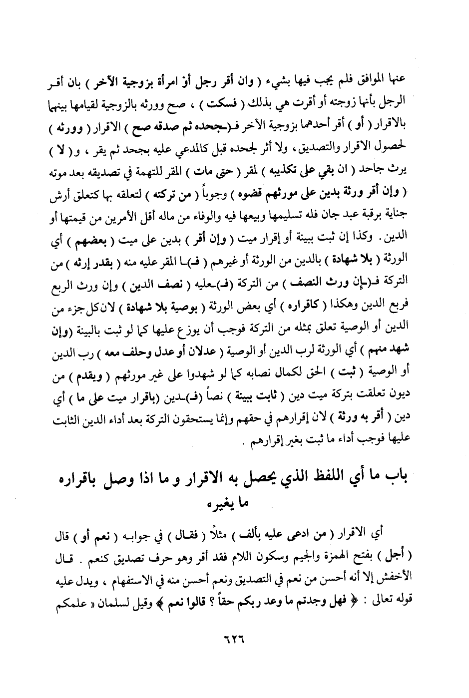 بَابُ مَا أَيُّ اللَّفْظِ الَّذِي يَحْصُلُ بِهِ الْإِقْرَارُ وَمَا إذَا وَصَلَ بِإِقْرَارِهِ مَا يُغَيِّرُهُ أَيْ الْإِقْرَارَ (مَنْ ادَّعَى عَلَيْهِ بِأَلْفٍ) مَثَلًا (فَقَالَ) فِي جَوَابِهِ (نَعَمْ أَوْ) قَالَ (أَجَلْ) بِفَتْحِ الْهَمْزَةِ وَالْجِيمِ وَسُكُونِ اللَّامِ فَقَدْ أَقَرَّ وَهُوَ حَرْفُ تَصْدِيقٍ كَنَعَمْ.