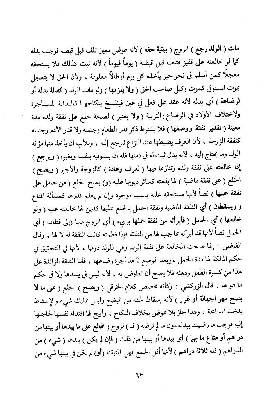 مَاتَ (الْوَلَدُ رَجَعَ) الزَّوْجُ (بِبَقِيَّةِ حَقِّهِ) ; لِأَنَّهُ عِوَضٌ مُعَيَّنٌ تَلِفَ قَبْلَ قَبْضِهِ فَوَجَبَ بَدَلُهُ كَمَا لَوْ خَالَعَتْهُ عَلَى قَفِيزٍ فَتَلِفَ قَبْلَ قَبْضِهِ (يَوْمًا فَيَوْمًا) ; لِأَنَّهُ ثَبَتَ كَذَلِكَ فَلَا يَسْتَحِقُّهُ مُعَجَّلًا كَمَنْ أَسْلَمَ فِي نَحْوِ خُبْزٍ يَأْخُذُهُ كُلَّ يَوْمٍ أَرْطَالًا مَعْلُومَةً ; وَلِأَنَّ الْحَقَّ لَا يُتَعَجَّلُ بِمَوْتِ الْمُسْتَوْفِي كَمَوْتِ وَكِيلِ صَاحِبِ الْحَقِّ. (وَلَا يَلْزَمُهَا) وَلَوْ مَاتَ الْوَلَدُ (كَفَالَةُ بَدَلِهِ أَوْ لِرَضَاعَةٍ) أَيْ: بَدَلَهُ ; لِأَنَّهُ عَقْدٌ عَلَى فِعْلٍ فِي عَيْنٍ فَيَنْفَسِخُ بِنِكَاحِهَا كَالدَّابَّةِ الْمُسْتَأْجَرَةِ وَلِاخْتِلَافِ الْأَوْلَادِ فِي الرَّضَاعِ، وَالتَّرْبِيَةِ (وَلَا يُعْتَبَرُ) لِصِحَّةِ خُلْعٍ عَلَى نَفَقَةِ وَلَدِهِ مُدَّةً مُعَيَّنَةً (تَقْدِيرُ نَفَقَةٍ، وَوَصْفِهَا) فَلَا يُشْتَرَطُ ذِكْرُ قَدْرِ الطَّعَامِ، وَجِنْسِهِ وَلَا قَدْرِ الْأُدْمِ، وَجِنْسِهِ كَنَفَقَةِ الزَّوْجَةِ ; لِأَنَّ الْعُرْفَ يَضْبِطُهَا عِنْدَ النِّزَاعِ فَيَرْجِعُ إلَيْهِ، وَلِلْأَبِ أَنْ يَأْخُذَ مِنْهَا مُؤْنَةَ الْوَلَدِ وَمَا يَحْتَاجُ إلَيْهِ ; لِأَنَّهُ بَدَلٌ ثَبَتَ لَهُ فِي ذِمَّتِهَا فَلَهُ أَنْ يَسْتَوْفِيَهُ بِنَفْسِهِ، وَبِغَيْرِهِ (وَيَرْجِعُ) إذَا خَالَعَتْهُ عَلَى نَفَقَةِ وَلَدِهِ، وَتَنَازَعَا فِيهَا (لِعُرْفٍ، وَعَادَةٍ) كَالزَّوْجَةِ، وَالْأَجِيرِ.