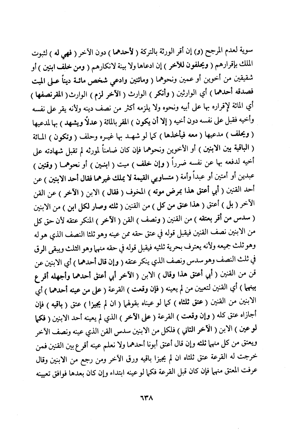 (وَمَنْ خَلَفَ ابْنَيْنِ) أَوْ شَقِيقَيْنِ مِنْ أَخَوَيْنِ أَوْ عَمَّيْنِ وَنَحْوِهِمَا (وَمِائَتَيْنِ وَادَّعَى شَخْصٌ مِائَةً دَيْنًا عَلَى الْمَيِّتِ فَصَدَّقَهُ أَحَدُهُمَا) أَيْ الْوَارِثَيْنِ (وَأَنْكَرَ) الْوَارِثُ (الْآخَرُ لَزِمَ) الْوَارِثَ (الْمُقِرَّ نِصْفُهَا) أَيْ الْمِائَةِ لِإِقْرَارِهِ بِهَا عَلَى أَبِيهِ وَنَحْوِهِ وَلَا يَلْزَمُهُ أَكْثَرُ مِنْ نِصْفِ دَيْنِهِ وَلِأَنَّهُ يُقِرُّ عَلَى نَفْسِهِ وَأَخِيهِ فَقُبِلَ عَلَى نَفْسِهِ دُونَ أَخِيهِ (إلَّا أَنْ يَكُونَ) الْمُقِرُّ بِالْمِائَةِ (عَدْلًا وَيَشْهَدُ) بِهَا لِمُدَّعِيهَا (وَيَحْلِفُ) مُدَّعِيهَا (مَعَهُ فَيَأْخُذُهَا) كَمَا لَوْ شَهِدَ بِهَا غَيْرُهُ وَحَلَفَ (وَتَكُونُ) الْمِائَةُ (الْبَاقِيَةُ بَيْنَ الِابْنَيْنِ) أَوْ الْأَخَوَيْنِ وَنَحْوِهِمَا فَإِنْ كَانَ ضَامِنًا لِمُوَرِّثِهِ لَمْ تُقْبَلْ شَهَادَتُهُ عَلَى أَخِيهِ لِدَفْعِهِ بِهَا عَنْ نَفْسِهِ ضَرَرًا (وَإِنْ خَلَفَ) مَيِّتٌ (ابْنَيْنِ) أَوْ نَحْوِهِمَا (وَقِنَّيْنِ) عَبْدَيْنِ أَوْ أَمَتَيْنِ أَوْ عَبْدًا وَأَمَةً (مُتَسَاوِيَيْ الْقِيمَةِ لَا يَمْلِكُ غَيْرَهُمَا فَقَالَ أَحَدُ الِابْنَيْنِ) عَنْ أَحَدِ الْقِنَّيْنِ (أَبِي أَعْتَقَ هَذَا بِمَرَضِ مَوْتِهِ) الْمَخُوفِ (فَقَالَ) الِابْنُ (الْآخَرُ) عَنْ الْقِنِّ الْآخَرِ (بَلْ) أَعْتَقَ (هَذَا عَتَقَ مِنْ كُلٍّ) مِنْ الْقِنَّيْنِ (ثُلُثُهُ وَصَارَ لِكُلِّ ابْنٍ) مِنْ الِابْنَيْنِ (سُدُسُ مَنْ أَقَرَّ بِعِتْقِهِ) مِنْ الْقِنَّيْنِ (وَنِصْفُ) الْقِنِّ (الْآخِرِ) الْمُنْكَرِ عِتْقُهُ لِأَنَّ حَقَّ كُلٍّ مِنْ الِابْنَيْنِ نِصْفُ الْقِنَّيْنِ فَيُقْبَلُ قَوْلُهُ فِي عِتْقِ حَقِّهِ مِمَّنْ عَيَّنَهُ وَهُوَ ثُلُثَا النِّصْفِ الَّذِي هُوَ لَهُ وَهُوَ ثُلُثُ جَمِيعِهِ وَلِأَنَّهُ يَعْتَرِفُ بِحُرِّيَّةِ ثُلُثَيْهِ فَيُقْبَلُ قَوْلُهُ فِي حَقِّهِ مِنْهُمَا وَهُوَ الثُّلُثُ وَيَبْقَى الرِّقُّ فِي ثُلُثِ النِّصْفِ وَهُوَ سُدُسٌ وَنِصْفُ الَّذِي يُنْكَرُ عِتْقُهُ.